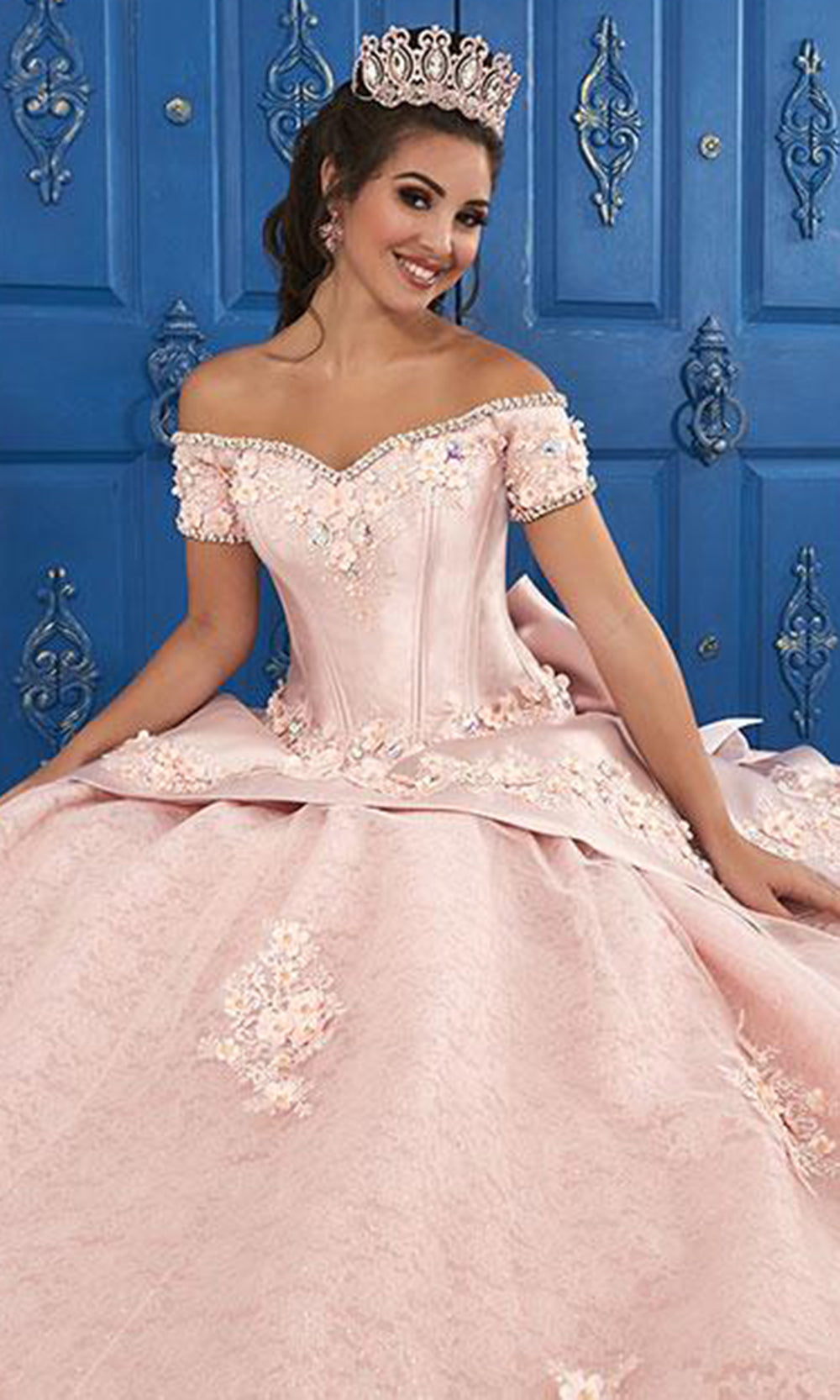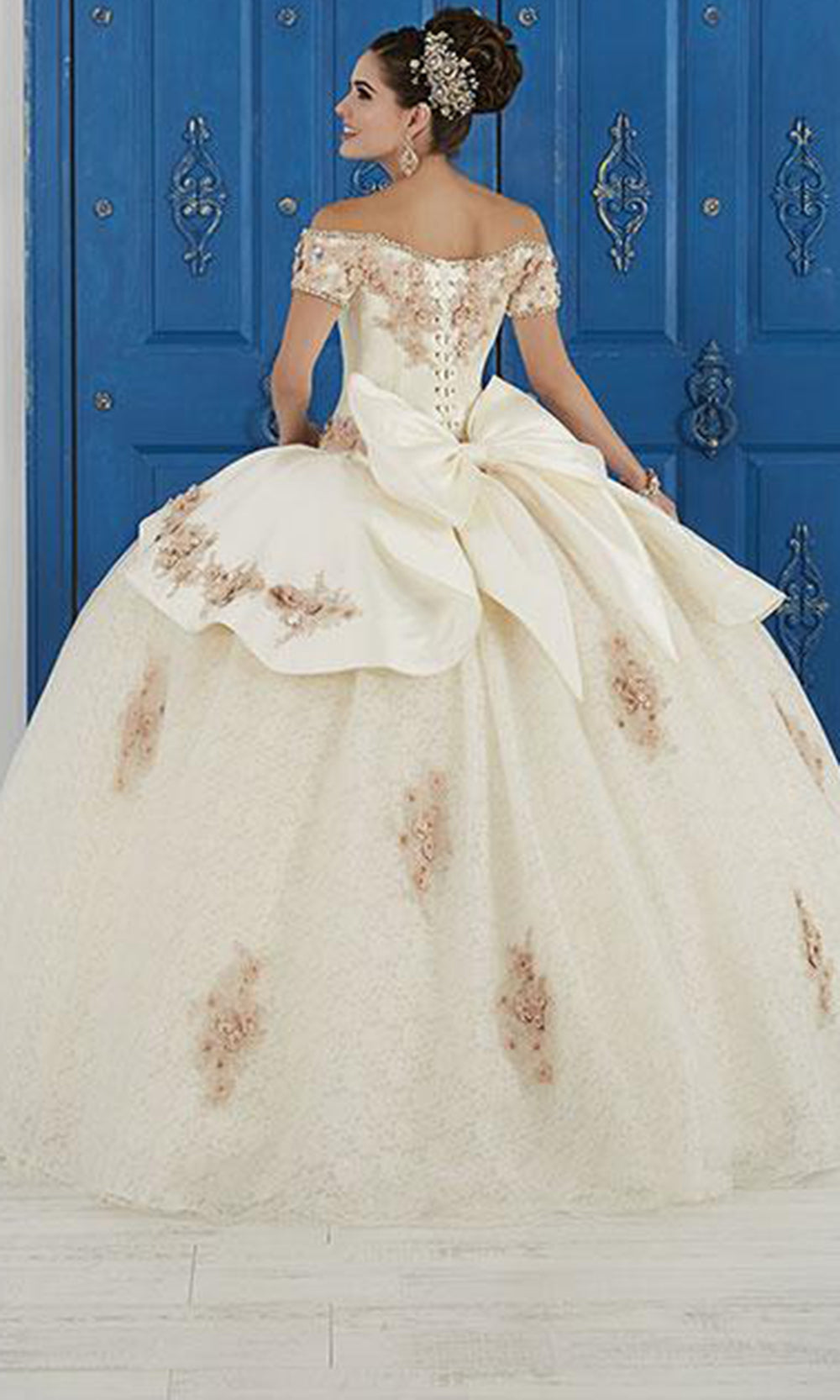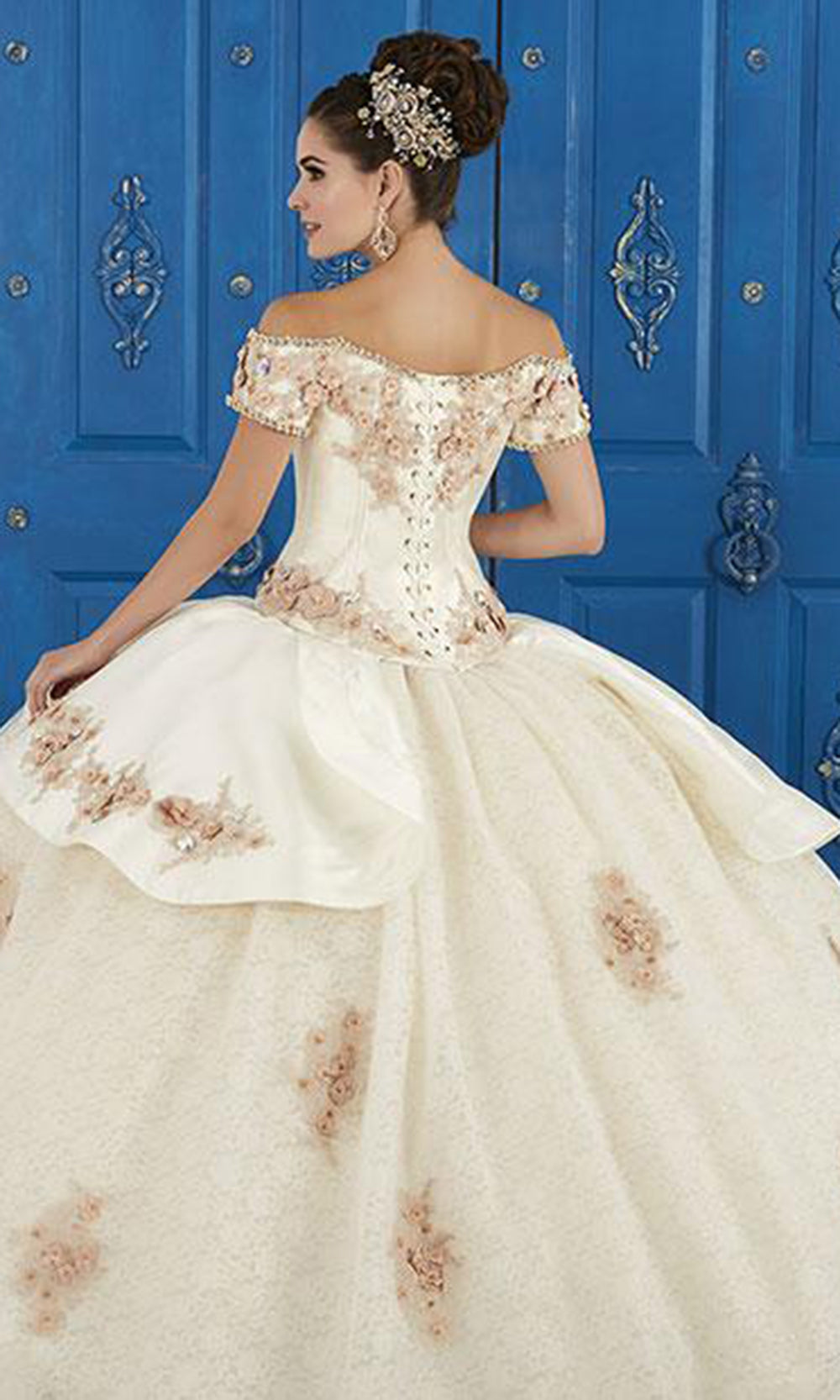 Fit for a princess, our new peplum ball gown by LA Glitter 24048 will make you look stunning! Crystal beading, lace applique and 3-dementional flowers adorned the neckline, sleeves, peplum skirt and basque waistline. The skirt combines organza and lace for a traditional look. Mikado bow is detachable. Enhance your visual appeal in this luxurious LA Glitter gown.