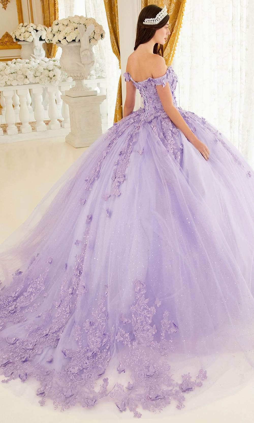 Ladivine 15709 is a whimsical masterpiece that will make you feel like a true butterfly princess. This enchanting ball gown features an alluring off-the-shoulder design, a sweetheart neckline, and delicate lace appliques that add a touch of romance and sophistication. The soft layers of tulle create a full-length skirt that flutters like butterfly wings as you move, and the gown culminates with an exquisitely appliqued trimmed train, leaving a trail of enchantment. Embrace your inner butterfly and float gracefully through any special occasion in Ladivine 15709. Model is wearing Lilac color.