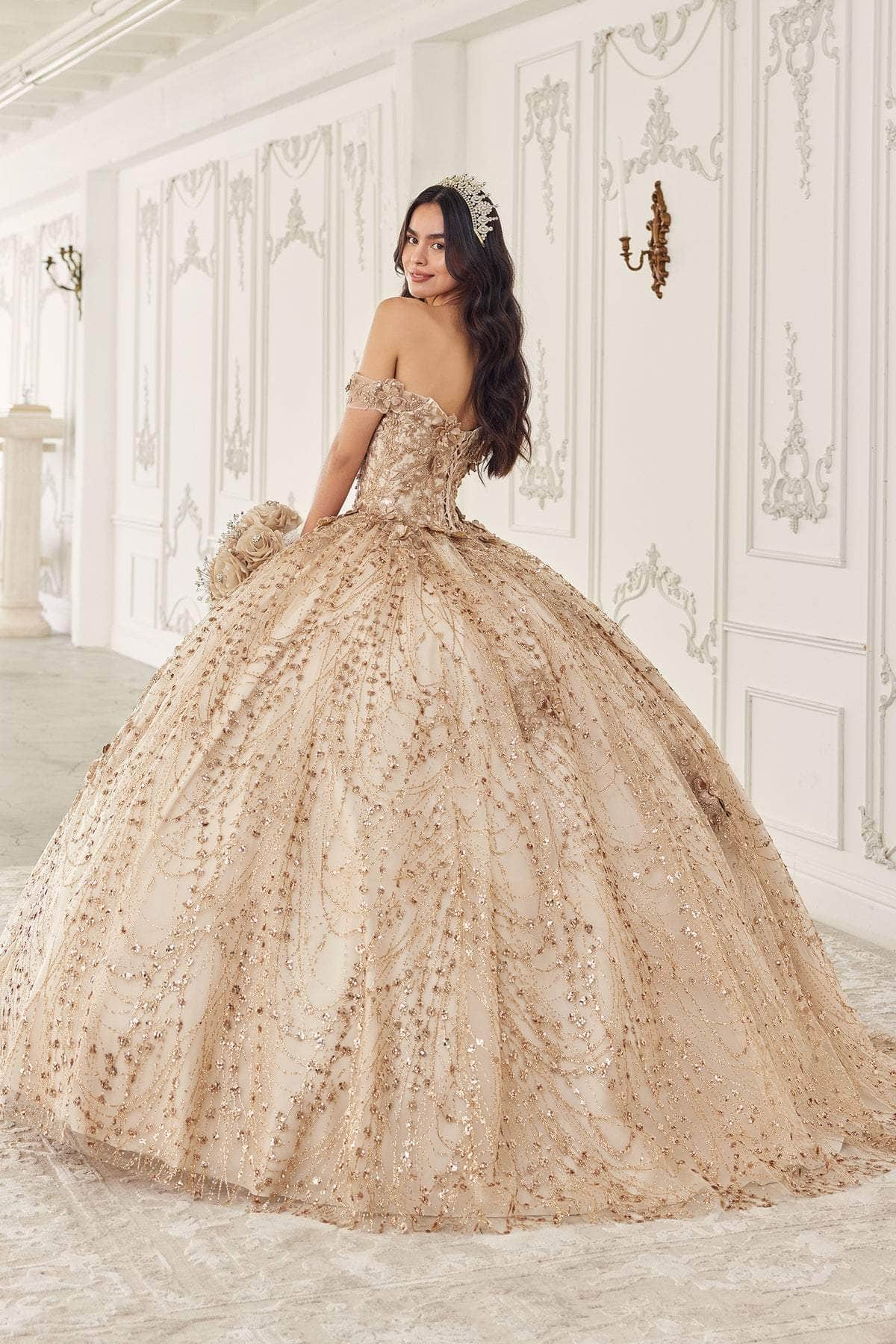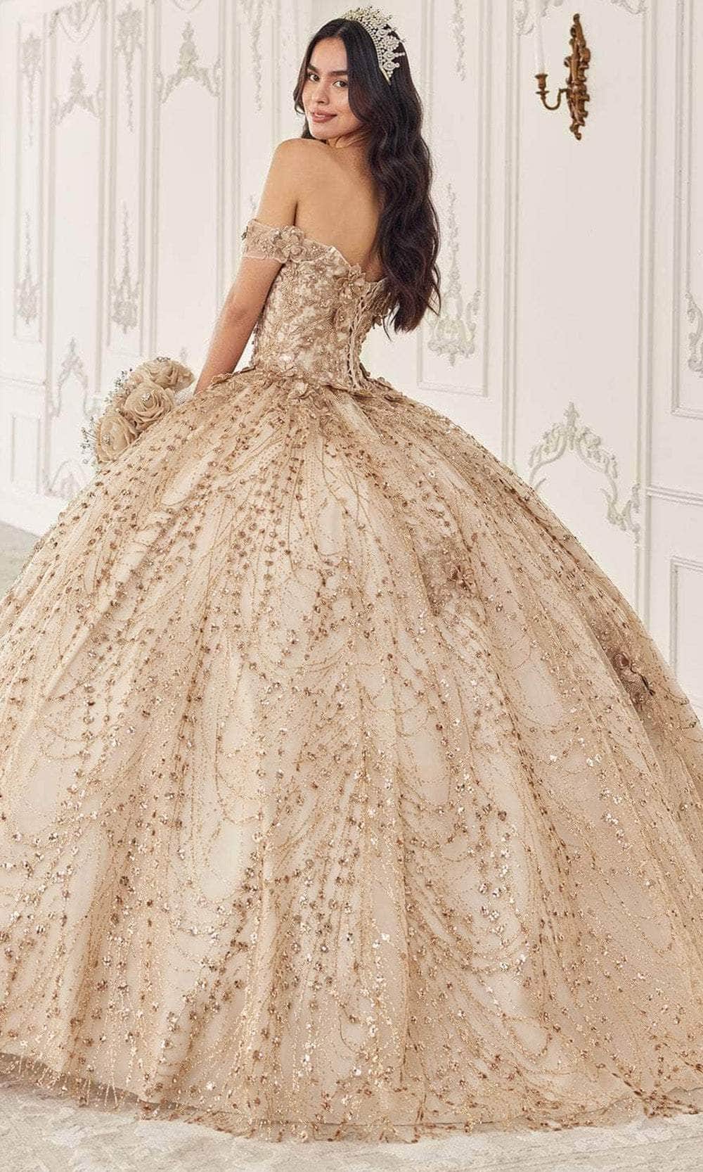 Shine bright in Ladivine by Cinderella Divine 15712, a mesmerizing off-the-shoulder ball gown that sparkles from every angle. Perfect for your Quinceanera celebration, this enchanting dress features a glitter embellished bodice adorned with dimensional floral appliques. The lace-up corset back closure ensures a flawless fit, accentuating your curves and flattering your figure. With a voluminous ballgown skirt crafted from layered tulle and delicately adorned with gold glitter print, every twirl becomes magical. Make a statement and dazzle on your special day with Ladivine by Cinderella Divine 15712, the epitome of elegance and grace. Model is wearing the Champagne color.