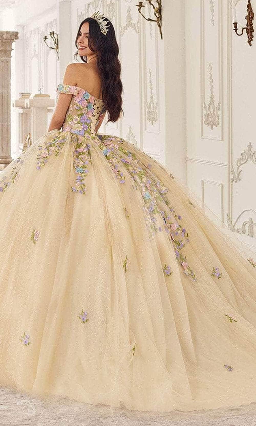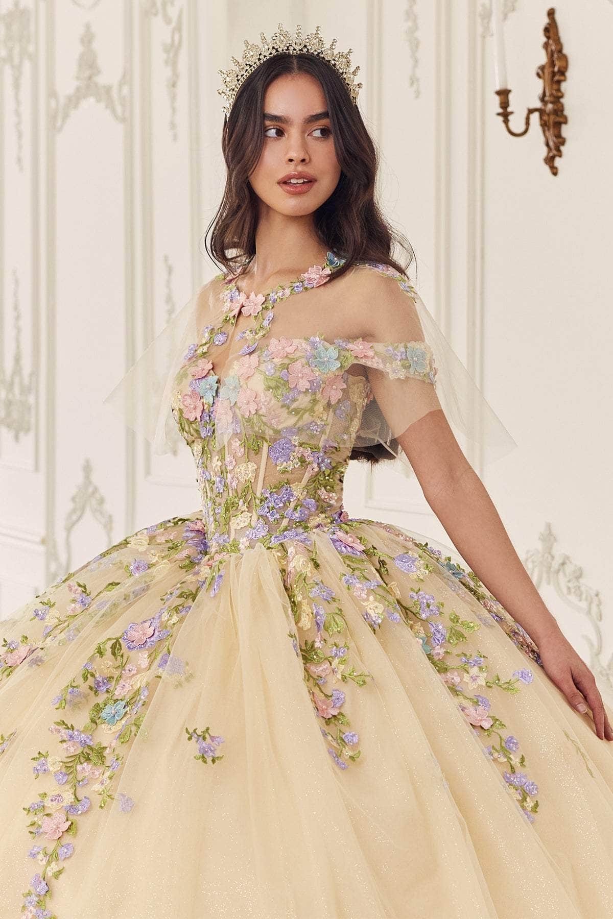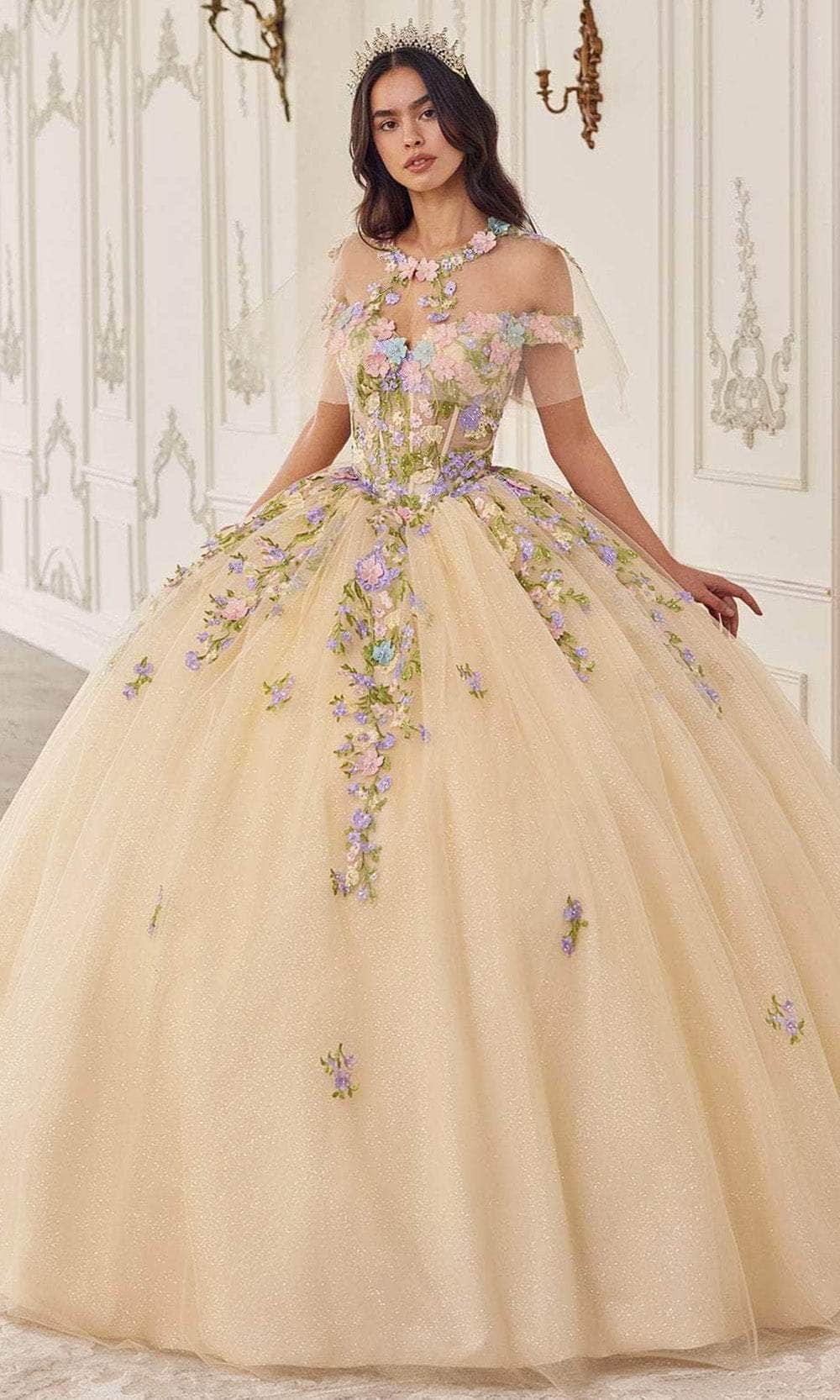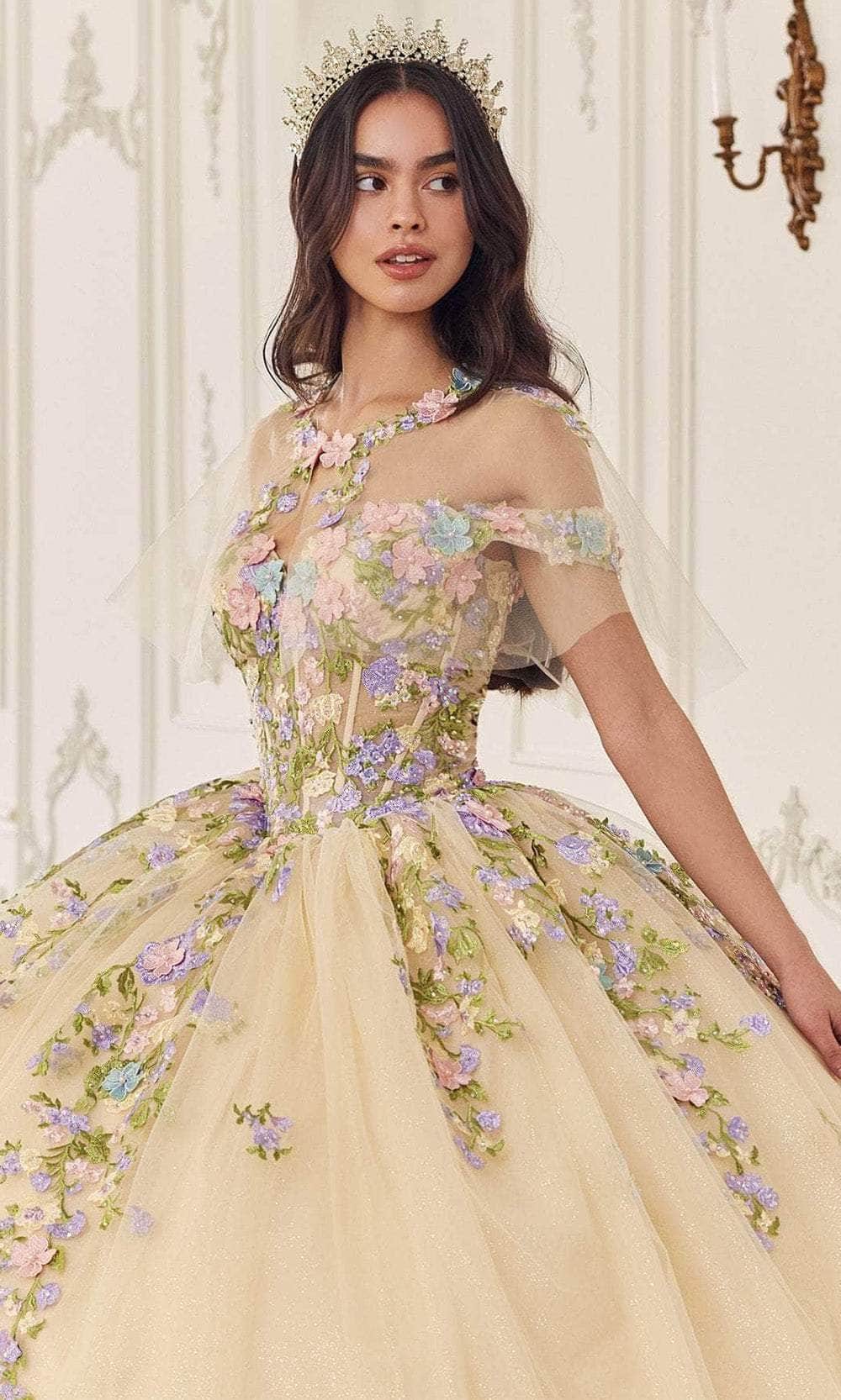 Experience the epitome of elegance and grace with the Ladivine by Cinderella Divine 15724 Quinceanera ballgown. This exquisite ensemble seamlessly blends timeless charm with modern sophistication, ensuring you feel like royalty on your special day. The off-the-shoulder neckline exudes elegance, while the sheer structured bodice and layered tulle skirt are adorned with delicate floral lace appliques, adding a touch of enchantment to the look. Elevating its allure, a long removable capelet offers versatility in styling and adds a hint of sophistication. Finished with a lace-up corset back closure, this stunning masterpiece culminates in a sweeping denouement, allowing you to dazzle with every step. Make unforgettable memories in our enchanting Ladivine by Cinderella Divine 15724 creation. Model is wearing the Champagne color.