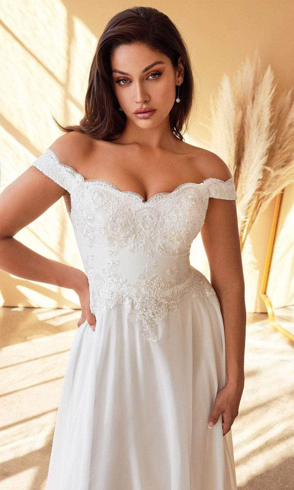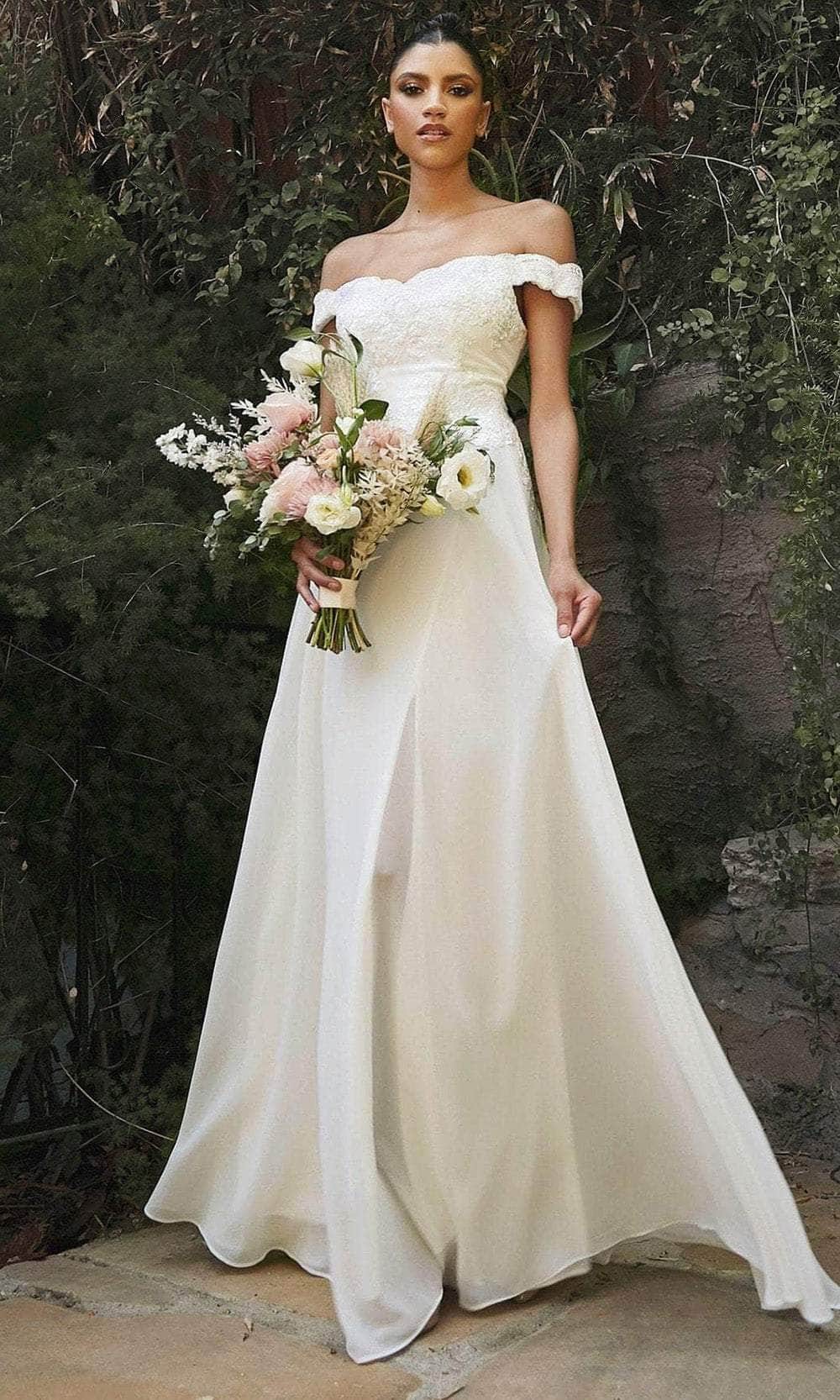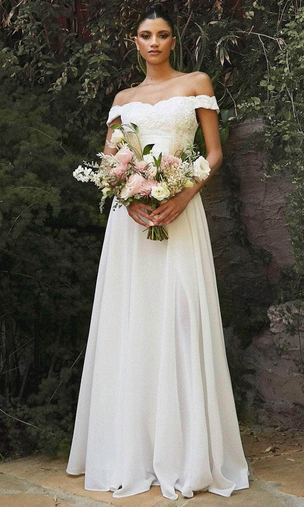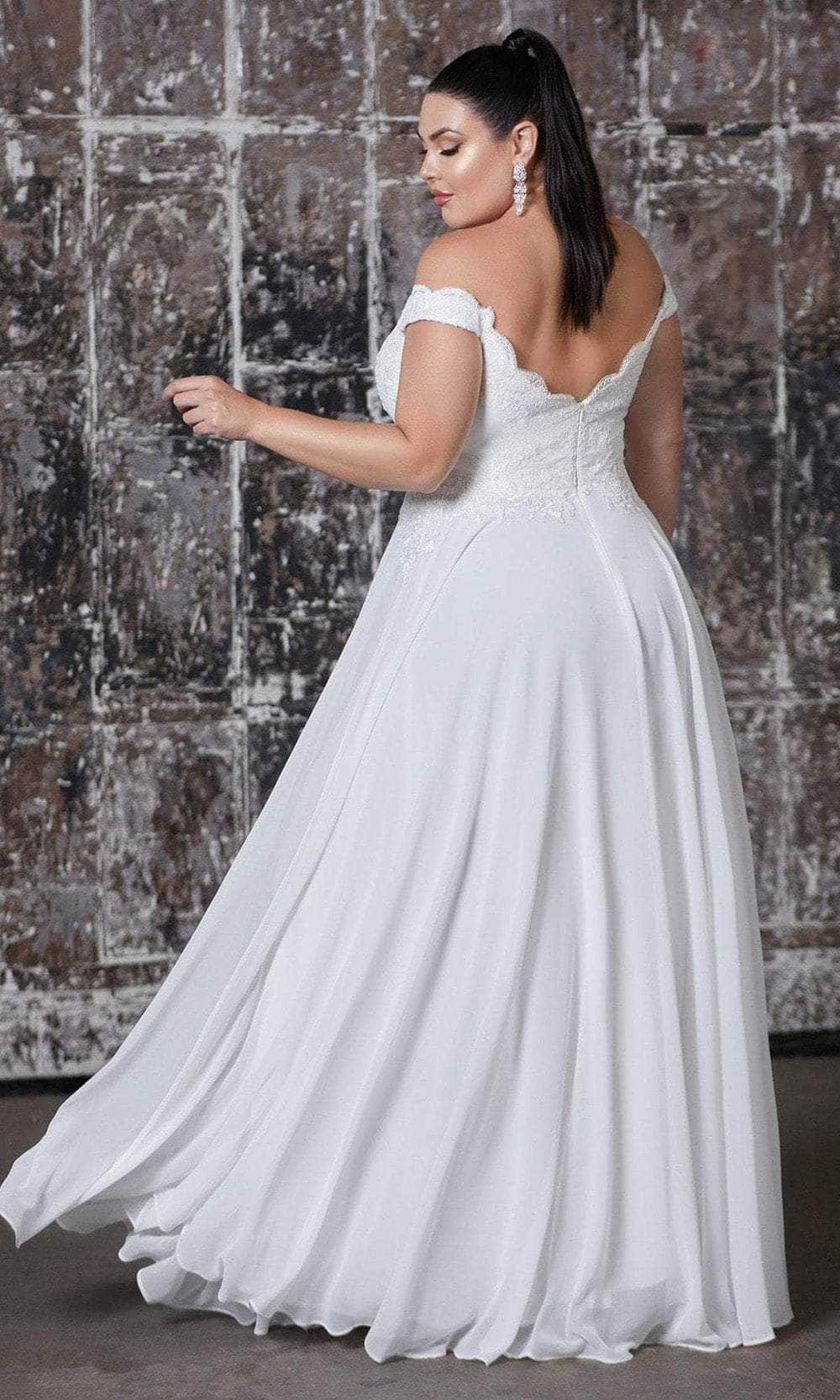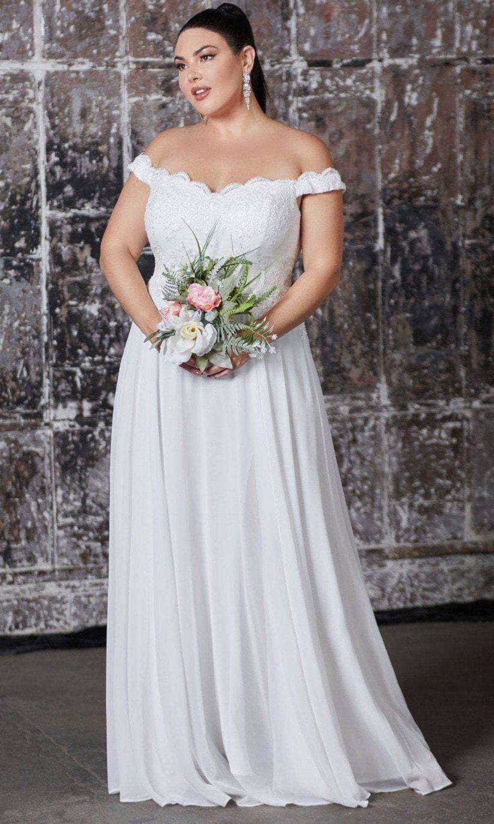 Radiate timeless beauty in the Ladivine by Cinderella Divine 7258W bridal gown. Effortlessly captivating, this dress boasts a classic and simple silhouette that will leave a lasting impression. The off-the-shoulder style gracefully frames the neckline, while the sculpting bodice is adorned with delicate floral motif lace appliqués, adding an organic touch of elegance. Softening the sweetheart neckline, eyelash-fringed scallops enhance the gown's romantic appeal. Layers of chiffon cascade from the natural waist to an even floor-length hem, exuding an ethereal charm. A tonal underpinning adds dimension to the skirt, while a front slit opening teases a glimpse of leg, adding a touch of allure to this enchanting ensemble. Experience the epitome of bridal elegance in the Ladivine by Cinderella Divine 7258W gown. Model is wearing the Off White color.