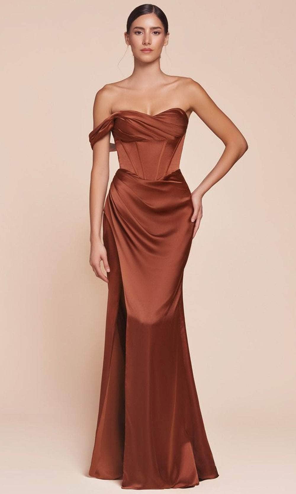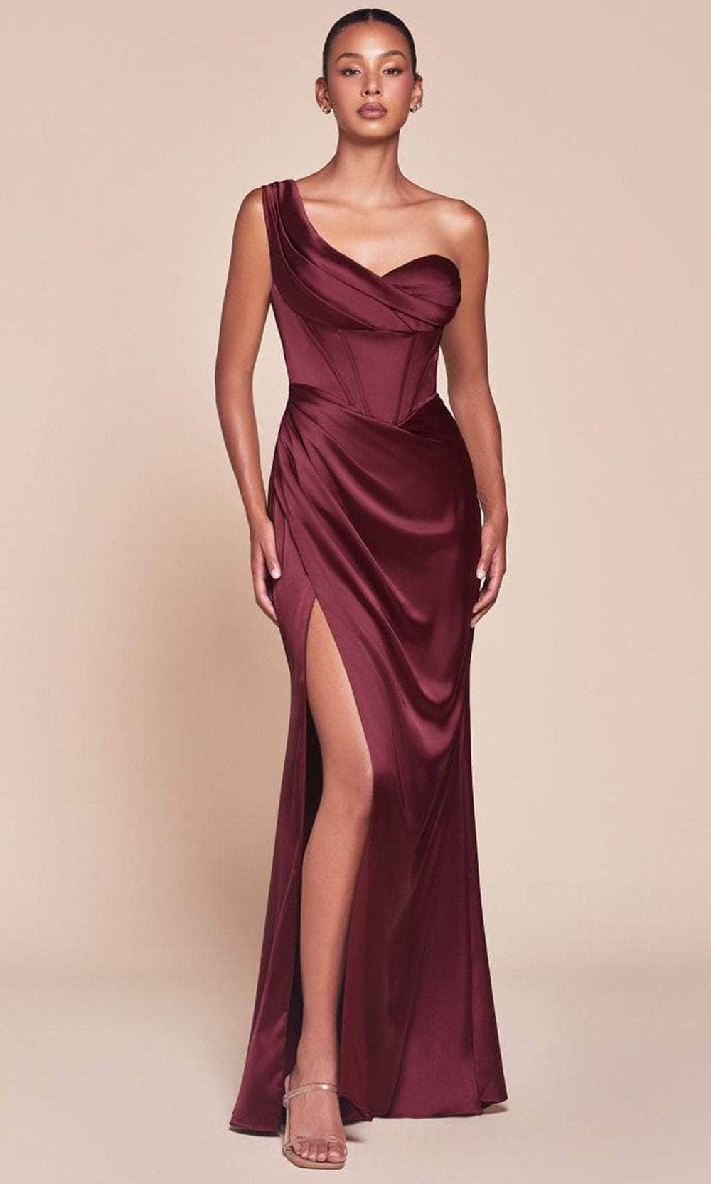 Radiate timeless sophistication in the Ladivine 7448 long gown, crafted for the contemporary muse. This fitted dress showcases exquisite tailoring on premium fabric and lining, creating a graceful silhouette. The pleated one-shoulder neckline adds a chic, modern flair, while the gathered waistline and high leg slit bring a refined edge. Constructed from luxurious satin, the boned bodice offers structure and support, and the center back zipper ensures a seamless finish. Perfect for bridesmaids, wedding guests, or formal events, the Ladivine 7448 gown blends classic elegance with thoughtful details, making it a standout choice for any special occasion. Dress is pictured in the following variants: Burgundy, Emerald, Lavender, Mauve Rose, Navy, Olive, Red, Sage, Sienna, Taupe, Smoky Blue, Champagne, Black, and Espresso.