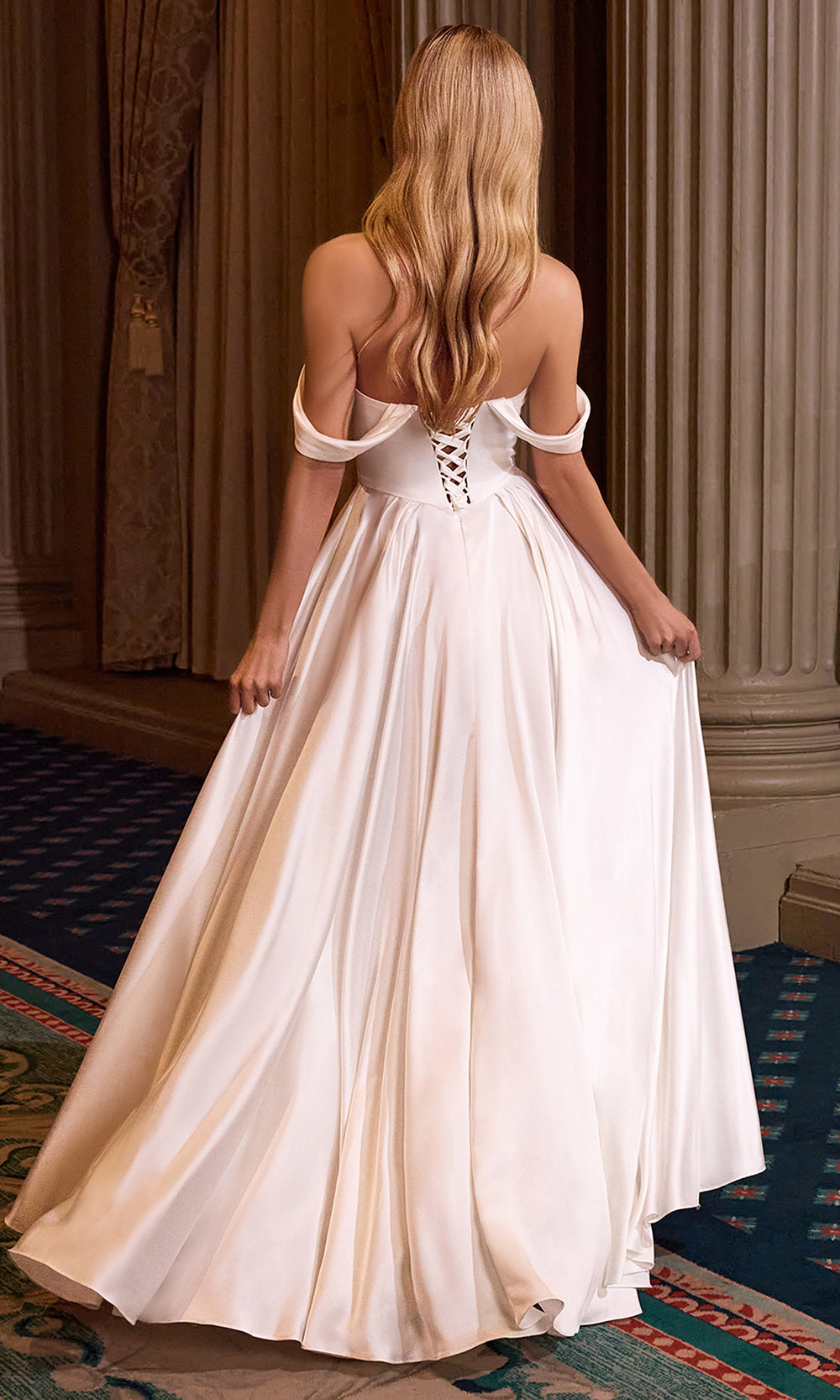 Showcase undeniable beauty and presence in this Ladivine 7449W. This gown begins with a cowl neckline and off shoulder sleeves that frames the shoulders with softness, while the draped bodice and corset lace-up back enhances the feminine shape. The Basque waist transitions into a voluminous A-line skirt, detailed with refined pleats and thigh-high slit that create graceful movement. With Ladivine 7449W, every detail speaks to timeless charm, making it a gown suited for life most meaningful occasions. Model is wearing Off White color.