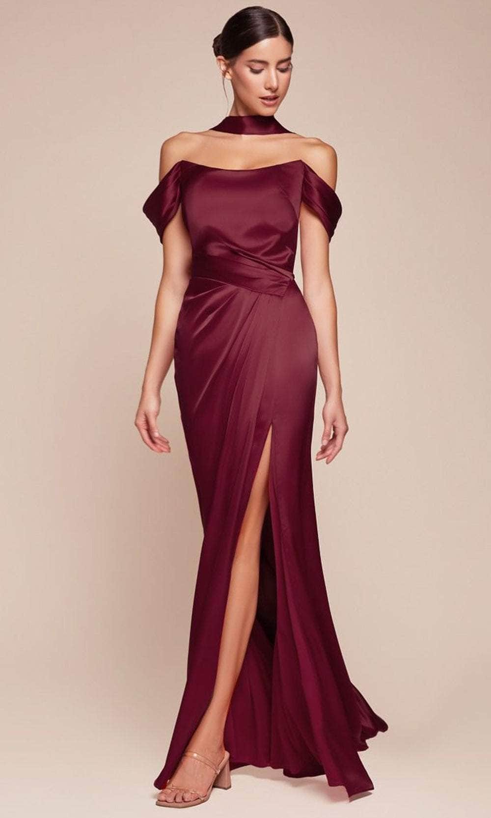 Elevate your style with the Ladivine 7452 gown, crafted for the woman who embraces elegance and sophistication. This fitted gown, made from luxurious satin and tailored with precision, is an impeccable choice for formal occasions. The off-the-shoulder neckline, gathered hip detail, and a sultry leg slit create a stunning silhouette. The boned bodice ensures a flawless fit, while the lace-up corset back provides a versatile touch, allowing for a wrap-around neck design. Ideal for bridesmaids or wedding guests, this gown blends timeless charm with contemporary flair, ensuring you stand out. Embrace refined luxury with the Ladivine 7452 gown, where every detail shines. Models are wearing the Black, Burgundy, Champagne, Emerald, Navy, Red, and Sienna colors.