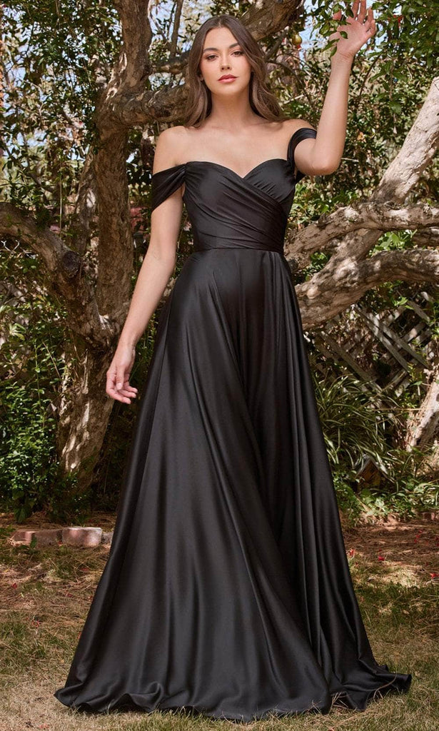 Walk in charm and let all heads turn on you in this Ladivine 7493C creation. This style exudes elegance with the ruched faux wrap bodice crowned by a sweetheart neckline and draped off-shoulder sleeves. The skirt forms an A-line silhouette in a full length hem and parts impressively with a side high slit for leg exposure. Completing this outfit look is a sweep train for a dramatic flair. Fall in love when you slip on this Ladivine 7493C evening gown. Models are wearing the Black, Burgundy, Emerald, French Navy, Lavender, and Mauve Rose colors.
