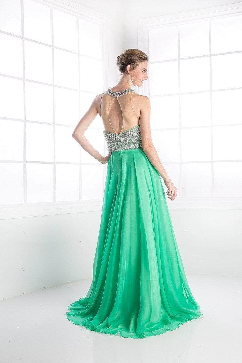 In this Ladivine 8107 masterpiece, dazzle the audience with your extraordinary grace. This sophisticated gown has an illusion high halter over a tonal sweetheart neckline accented with lustrous pearls that highlight the sheer cut-in bodice. This A-line skirt is made of gossamer chiffon and has a keyhole cutout illusion racerback. It flutters beautifully down to a full-length hemline. Your iridescent elegance in this Ladivine 8107 chiffon gown will have them swept off their feet. Model is wearing the Coral, Sky Blue and Yellow colors.