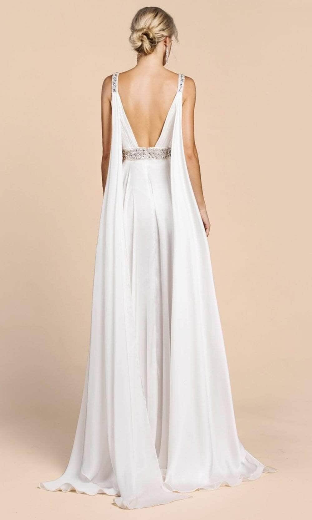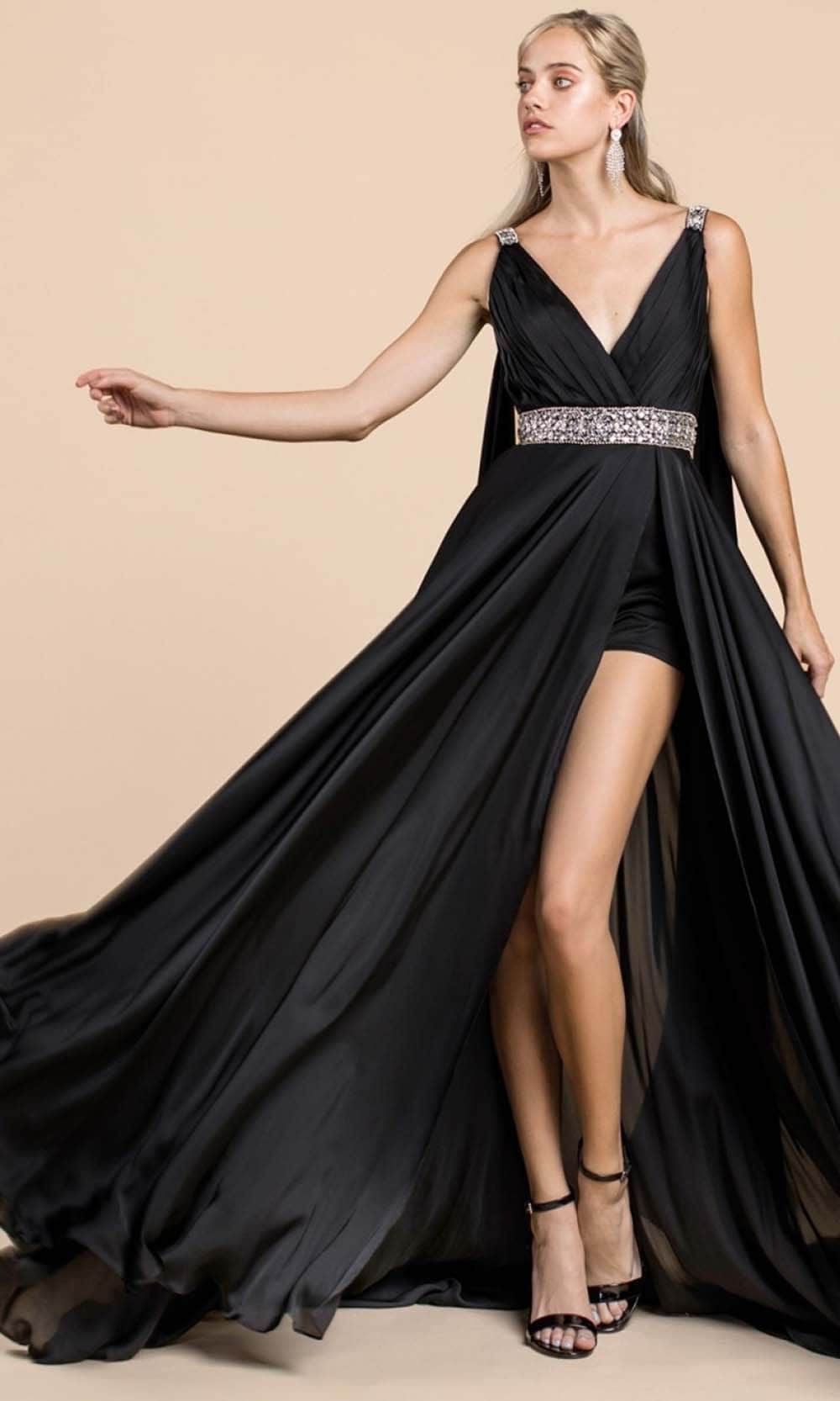 Make an unforgettable entrance in this stunning Ladivine A0065 gown. Draped in luxurious satin, this evening dress features a sleeveless surplice bodice and a V-shaped open back. The embellished straps and waistband add a touch of sparkle, while dramatic long capes flow from the shoulders for an added statement. The full-length skirt elegantly flares out, complete with a sky-high slit to reveal a chic mini-underskirt. Radiate sophistication and allure in this glamorous Ladivine creation.