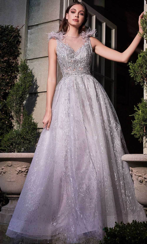 When it comes to style, always trust your instincts, be confident and wear this Ladivine B704 evening gown to your next social gathering. This sleeveless gown has an illusion jewel neckline with a V neckline and embroidered patterning on the bodice. The feathered thin shoulder straps that frame the flattering full sheered back in a matching design with a center zipper support the bodice. For modesty, the A line sheath skirt is fully lined in sparkling tulle and falls to a full length hem. There is no such thing as sparkling too much with this Ladivine B704. Model is wearing the Silver Mauve color.