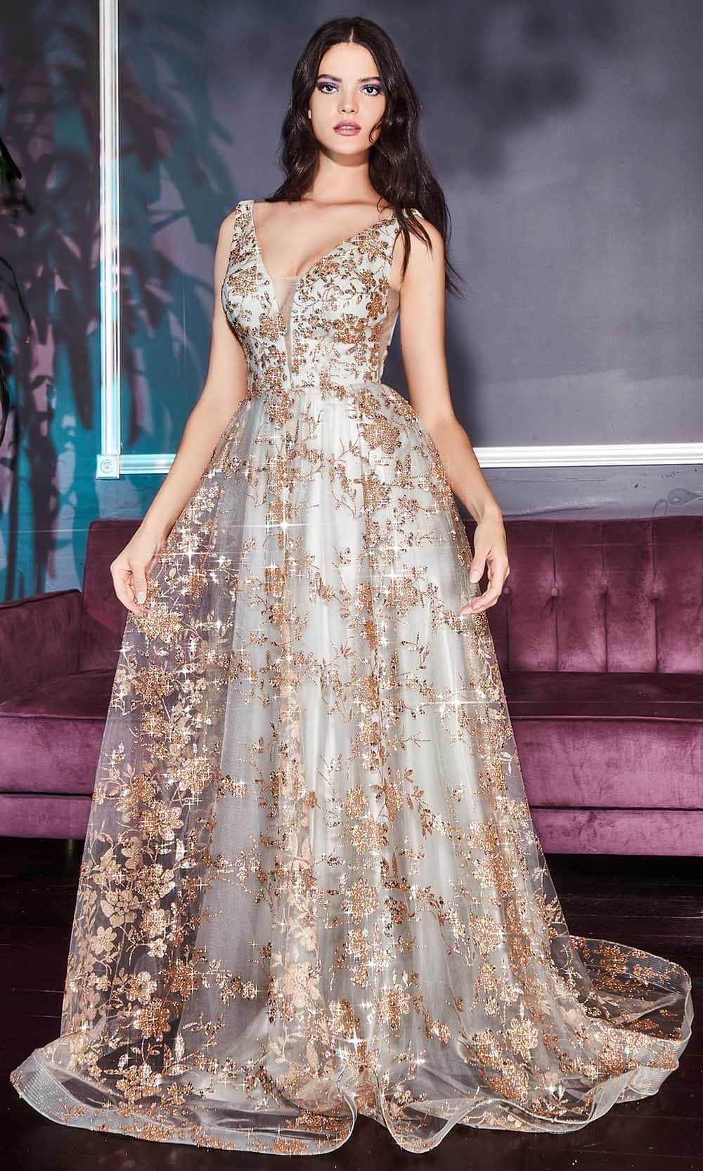 Orchestrate a moment for you to shine in this LaDivine CB068 creation. This exquisite gown has a sleeveless bodice completely adorned with metallic lace patterned over a net overlay. It also presents a plunging v-neckline, wide shoulder straps, and modesty mesh inset at the bust and side waist. The low v-shaped back exposes a hint of skin and has a zipper closure. From the natural waist, the skirt flares an A-line silhouette that reaches the sweeping train and ends with stylish horsehair hem. Sizzle all night in this fabulous LaDivine CB068 masterpiece. Models are wearing Champagne, Gold-Mocha, and Gold-Sage colors.