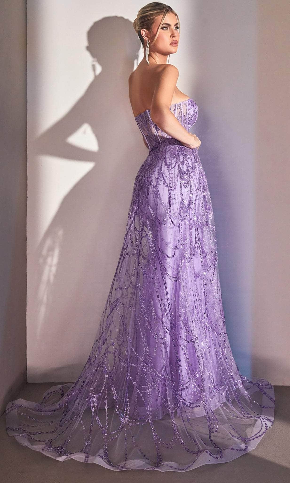 Transform into a total stunner in this impeccably made Ladivine CB095 creation. Festooned with an elaborate spectacle of garland motif glitter print design, this gown parades a sheer bustier bodice with corset boning accents. Designed with a strapless rendering and a sheer midrise back, the opulently styled skirt reveals a sheath silhouette as a gossamer overskirt starts from the waist and ends in a sweeping denouement. Glow up with a sophistication that captures everyone’s attention in this Ladivine masterpiece. Models are wearing the Smoky Blue, Emerald and Lavender colors.
