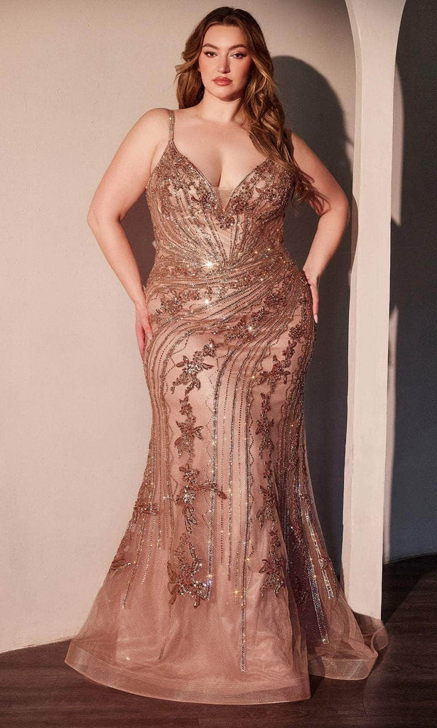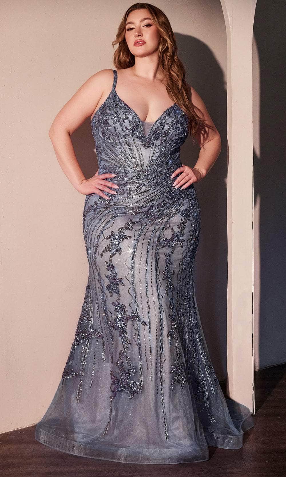 Saunter in style with this Ladivine CC0389C gown, a stunning creation designed to captivate and impress. This fit-and-flare dress boasts a plunging neckline and delicate thin straps, creating a striking and graceful silhouette. The gown features intricate crystal beading and embellished lace that cascade over tulle, accentuating the cinched waistline and structured bodice. The lace-up corset back ensures a perfect and customizable fit, enhancing the overall elegance of the Ladivine CC0389C. Models wearing Black-Nude, Rose Gold, and Smoky Blue colors.