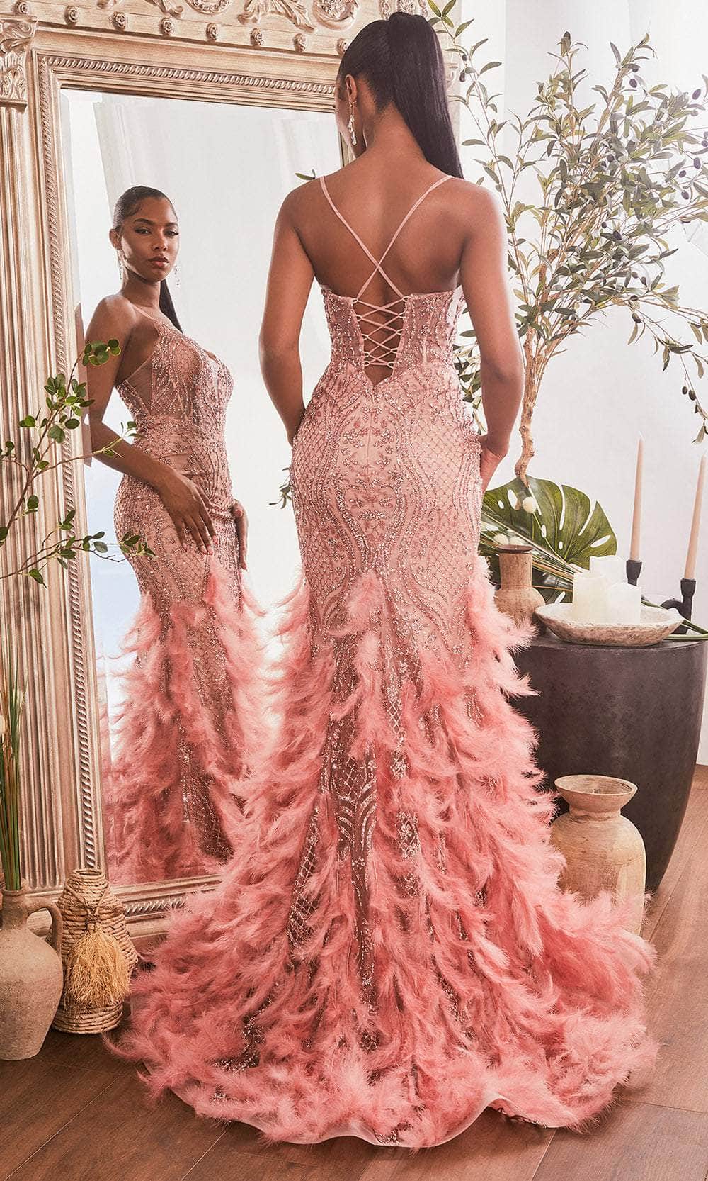 Elevate your allure in Ladivine CC1608, a breathtaking gown that commands attention. The sleeveless corset bodice, featuring a plunging V-neckline with a sheer insert, creates a captivating focal point. The crisscross back, concluding in a lace-up tie, ensures a tailored fit, while the back zipper closure guarantees security. The floor-length skirt, adorned with feathers, adds a touch of glamour, flowing gracefully and concluding with a train. Ladivine CC1608 promises a mesmerizing presence, making it the perfect choice for special occasions where sophistication meets contemporary allure. Models are wearing Rose and Sage colors.