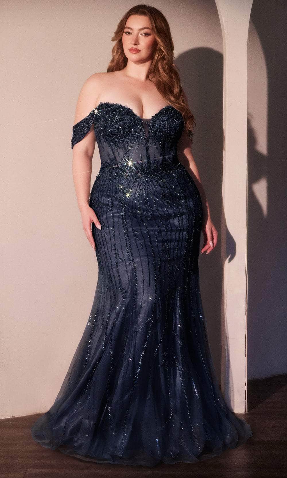 Shine brightly in this Ladivine CC341C gown, a stunning creation designed to captivate and impress. This fitted dress features a sweetheart off-the-shoulder neckline and a sheer bodice adorned with a beautiful floral beaded motif. The sequin and bead-encrusted tulle overlay lining adds a touch of glamour, creating a luxurious and sophisticated look. The structured bodice offers enhanced support, ensuring a comfortable and flattering fit. With a lace-up corset back, this Ladivine CC341C provides a secure and customizable fit, perfect for prom and formal events. Models are wearing Navy and Smoky Blue colors.