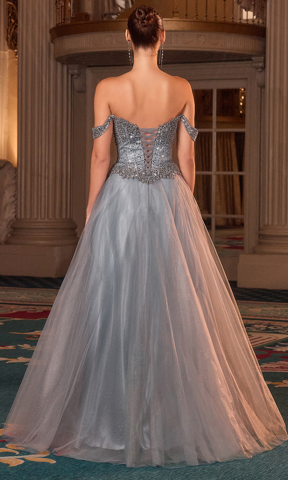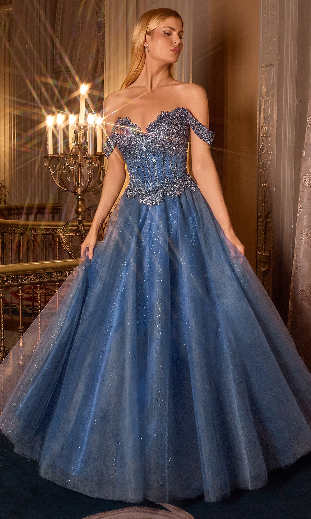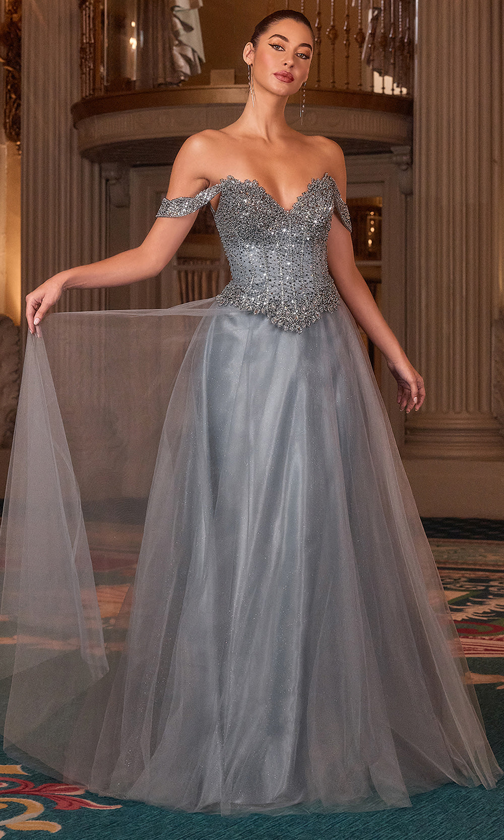 A vision of romance and grandeur, the Ladivine CC471 creates a fairytale presence at any occasion. The off-shoulder draped sleeves and sweetheart neckline softens the look, framed by a corset bodice adorned with crystal beaded and sequins. Its exposed boning offers definition and support, balanced by a lace-up back that ensures a secure fit. The layered A-line skirt crafted from glitter tulle cascades into a floor length hem that sparkles with every movement. With the Ladivine CC471, timeless charm and modern detail unite to create a gown worthy of life most special moments. Models are wearing Cobalt, Dark Sage, Mocha Gold, and Smoky Blue colors.