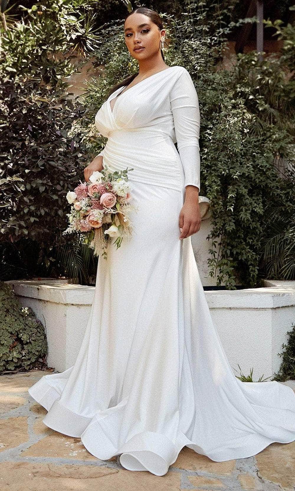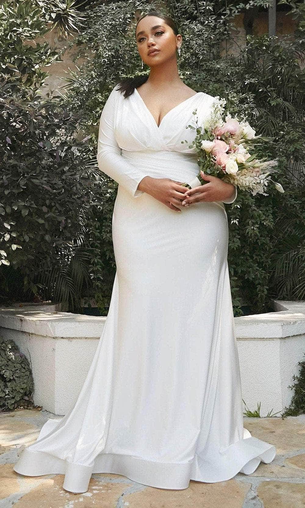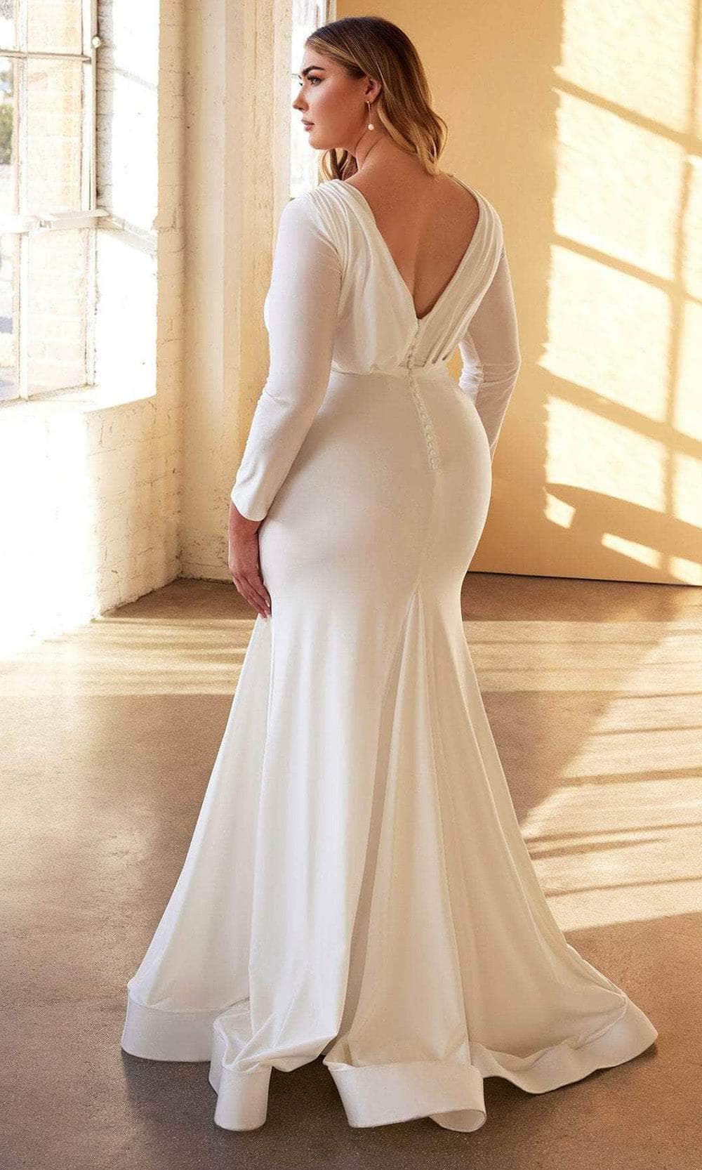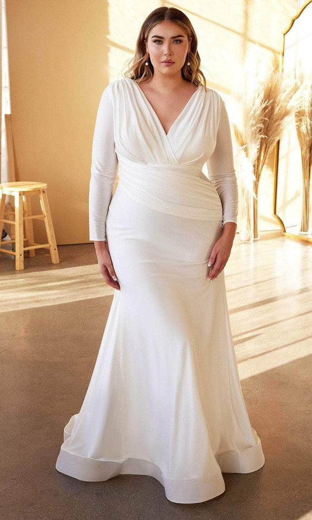 Glide down the aisle with grace and elegance in the Ladivine by Cinderella Divine CD0169C bridal gown, a captivating blend of romance and charm. Made from smooth, shiny stretch satin, this gown features long sleeves and a flattering close-fitting silhouette that highlights your figure. The pleated bodice showcases a plunging surplice neckline, complemented by an asymmetric sash-like pleated panel that drapes elegantly over the waist, adding a touch of refinement. Delicate covered buttons adorn the back, leading to a flowing mermaid hem trimmed with horsehair for extra style. With a sweeping train that cascades to the floor, this gown ensures a stunning entrance on your big day. Embrace timeless sophistication with Ladivine by Cinderella Divine CD0169C. Model is wearing the Off White color.