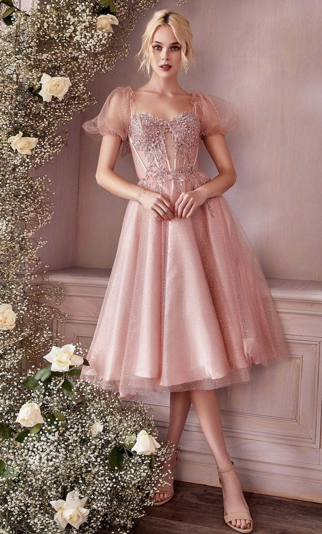 The Ladivine CD0187 dress promises to steal the show with its dazzling rhinestone details and lace appliques. The sheer corset boned bodice and sweetheart neckline create a flattering silhouette, while the sheer puff sleeves add a dramatic flair. The ornate midrise back and the layered skirt with a tea-length hemline complete the look, ensuring you turn heads wherever you go. Radiate elegance and star-quality in this mesmerizing Ladivine masterpiece.