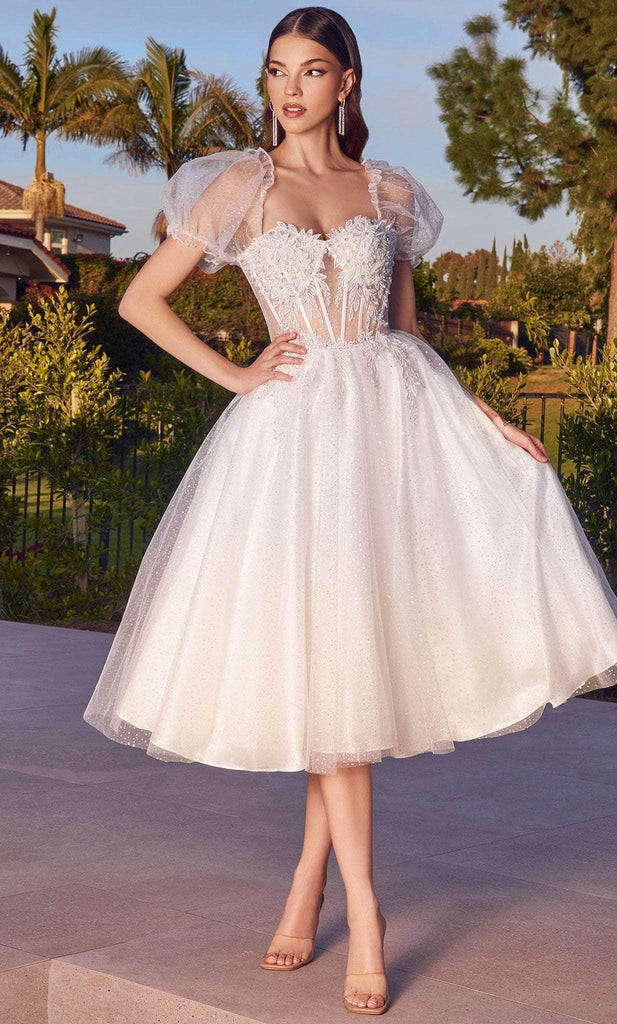 Experience a mesmerizing transformation on prom night with the exquisite Ladivine CD0187 special occasion dress. Mesmerize everyone in this stunning dress in a knee-length hem. Featuring a sweetheart neckline, sheer puff sleeves, and a see-through corseted bodice. It exudes fit and flare style as it is matched with an A-line silhouette shimmering with glitters. Back zipper is used to close this piece. Elevate your divine feminine beauty with Ladivine CD0187W, the perfect choice for a celebration. Model is wearing Off White color.