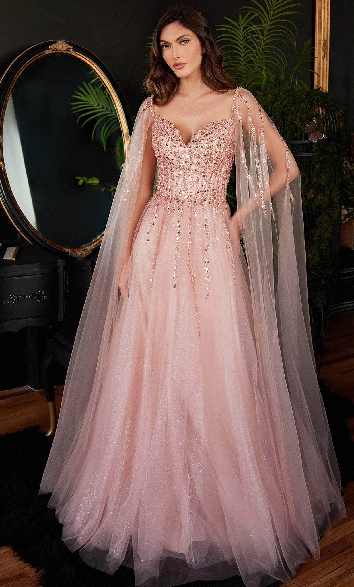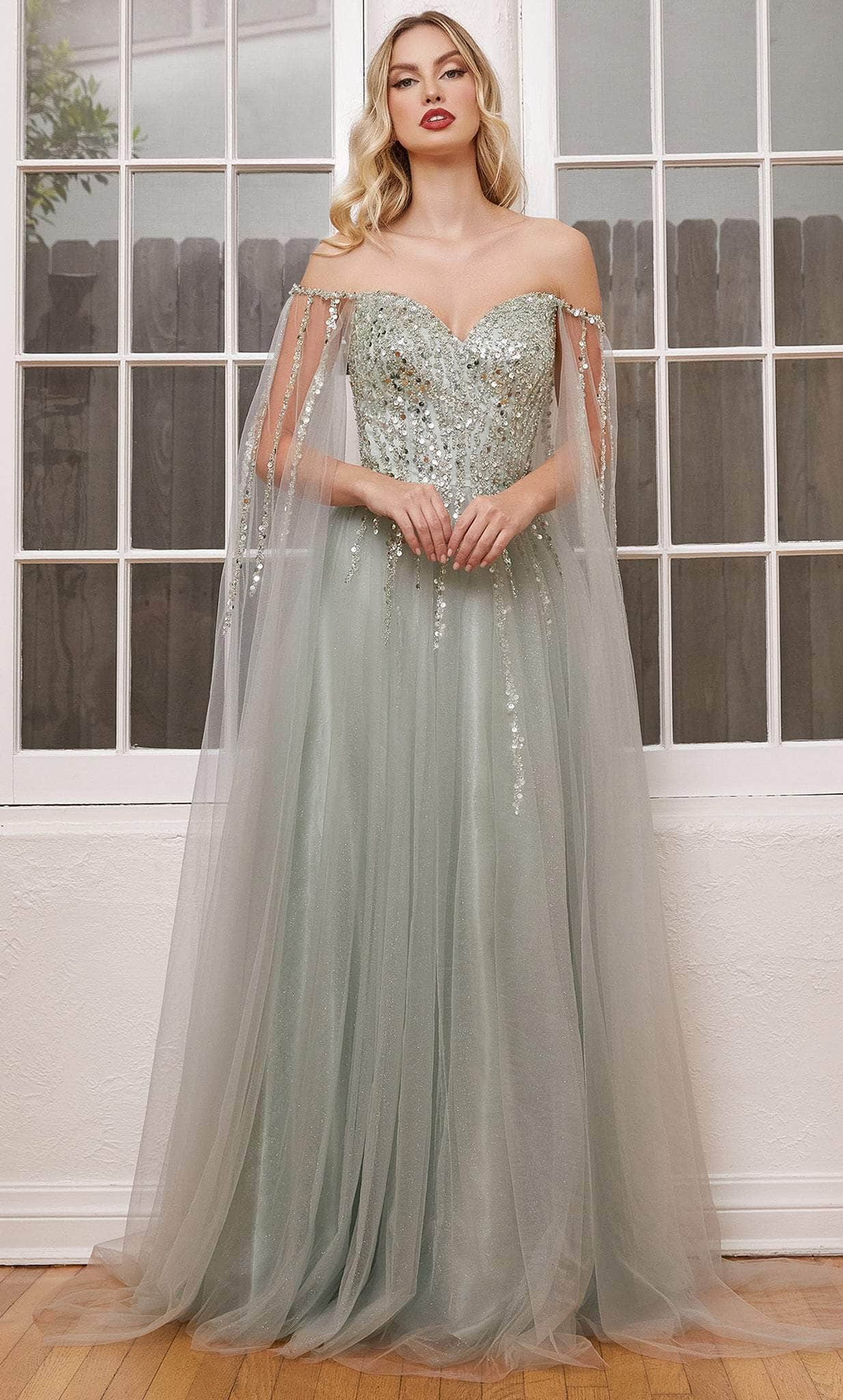 Achieve a polished, fashionable atmosphere with this amazing Ladivine CD0204 creation. Embellished with iridescent sequin details trailing the bodice, this gown parades a sweetheart neckline with an off shoulder styled cape sleeve cascade. Designed with a midrise back, the embellished skirt sparkles as it crafts an A-line silhouette with a frothy train. Accentuate your femininity in this captivatingly crafted Ladivine CD0204 masterpiece. Models are wearing the Black, Blush, English Violet, Sage and Smokey Blue colors.