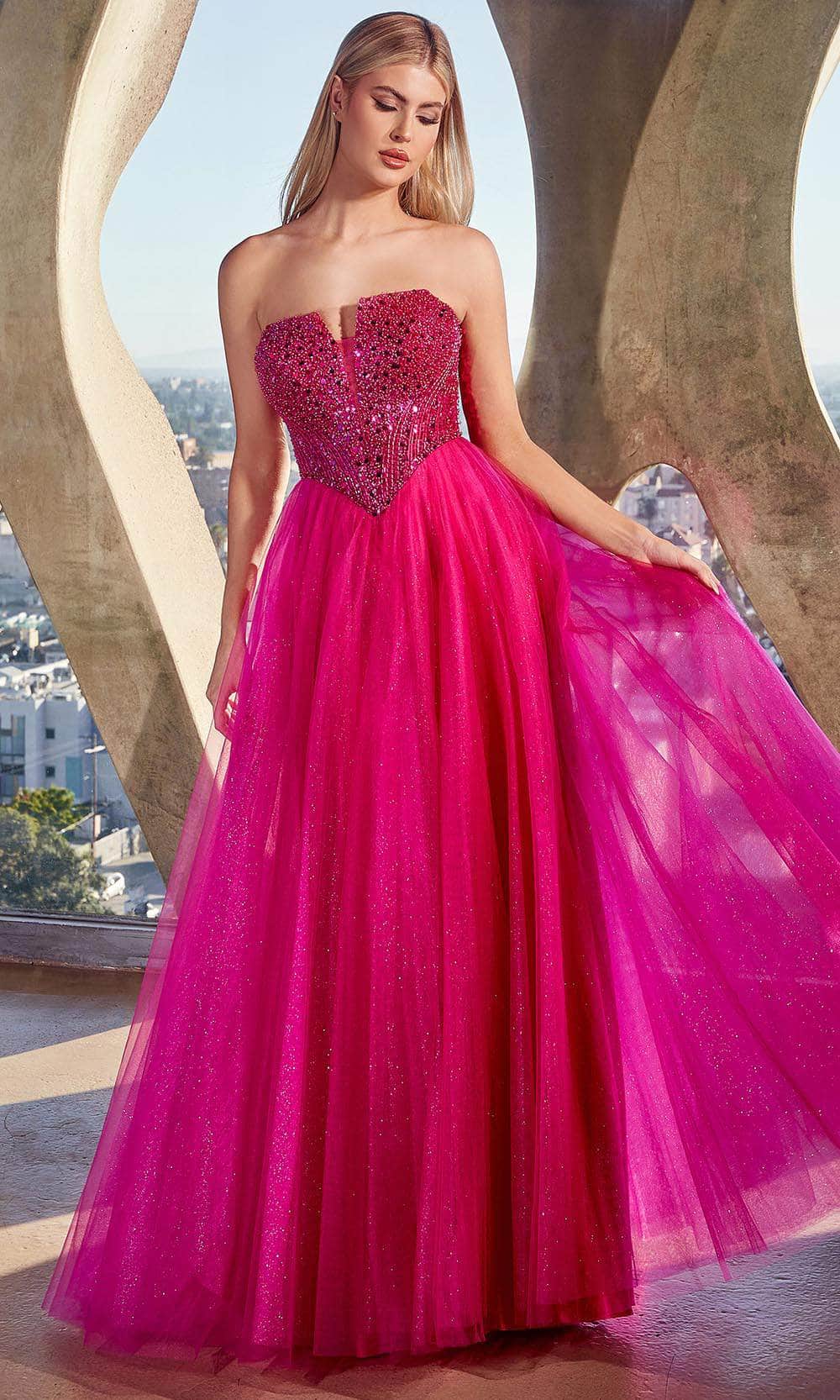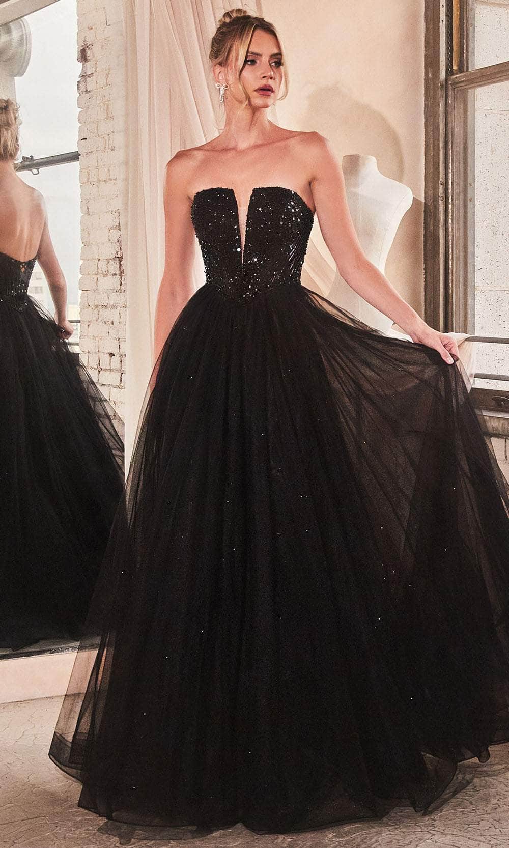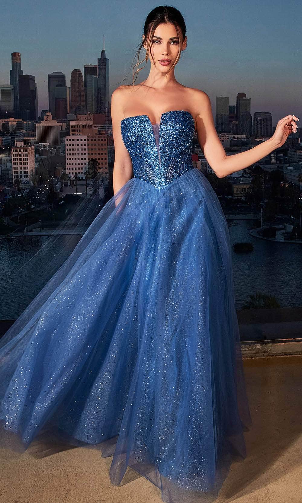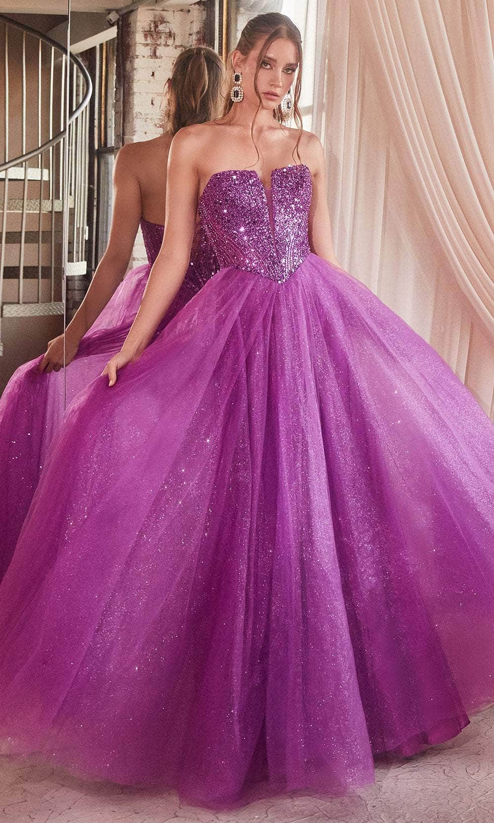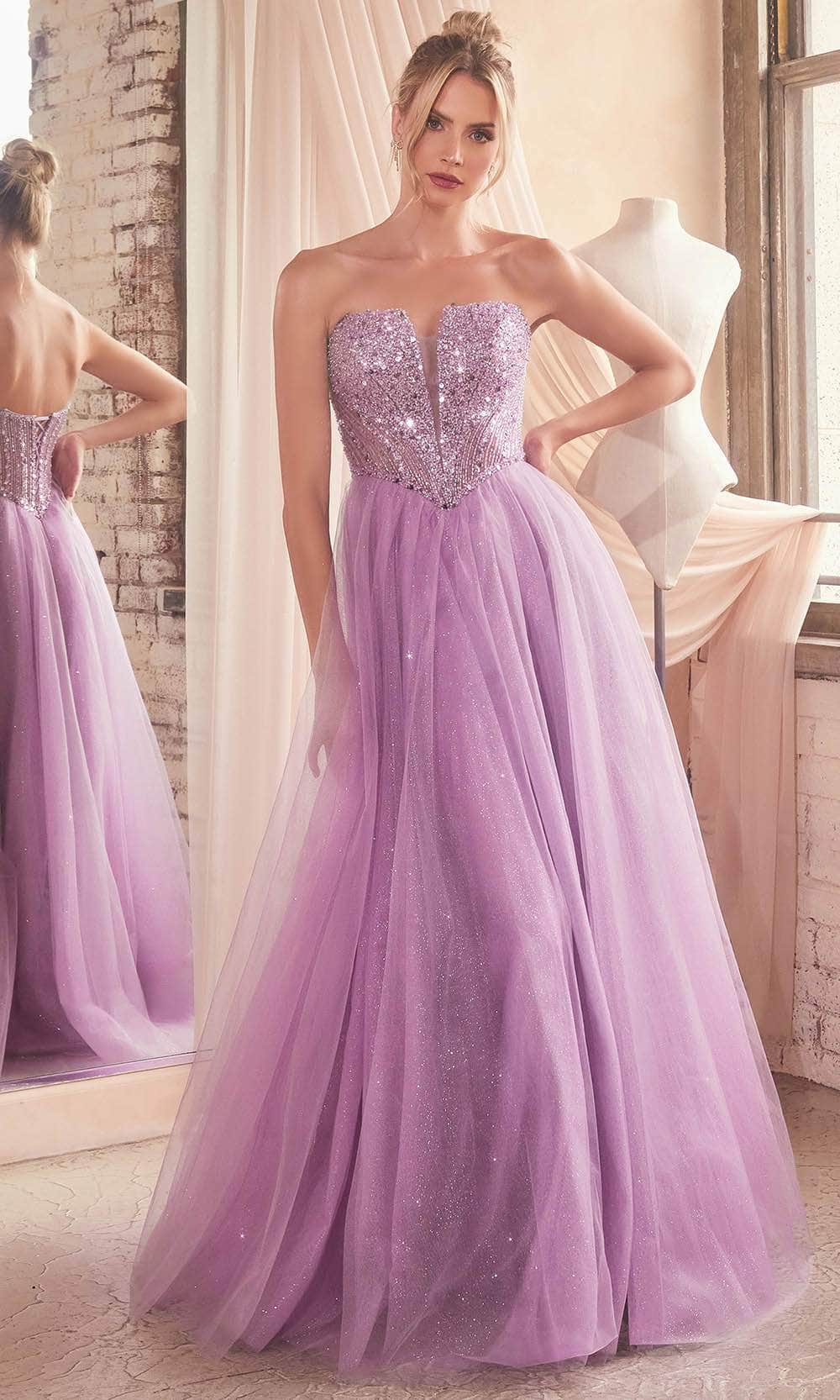 Make a statement at any special event with this Ladivine CD0217 ensemble. This strapless gown is embellished with intricate beading and sequins on the top bodice to dazzle the crowd with every sparkle. Features are the plunging v-neckline, basque waist, and a sultry mid-open back with lace-up design. Crafted with glitter tulle, the layered skirt flares an A-line silhouette that gracefully flatters all body types and ends with a majestic sweeping train. You are a breath of fresh air in this dreamy Ladivine CD0217 creation.