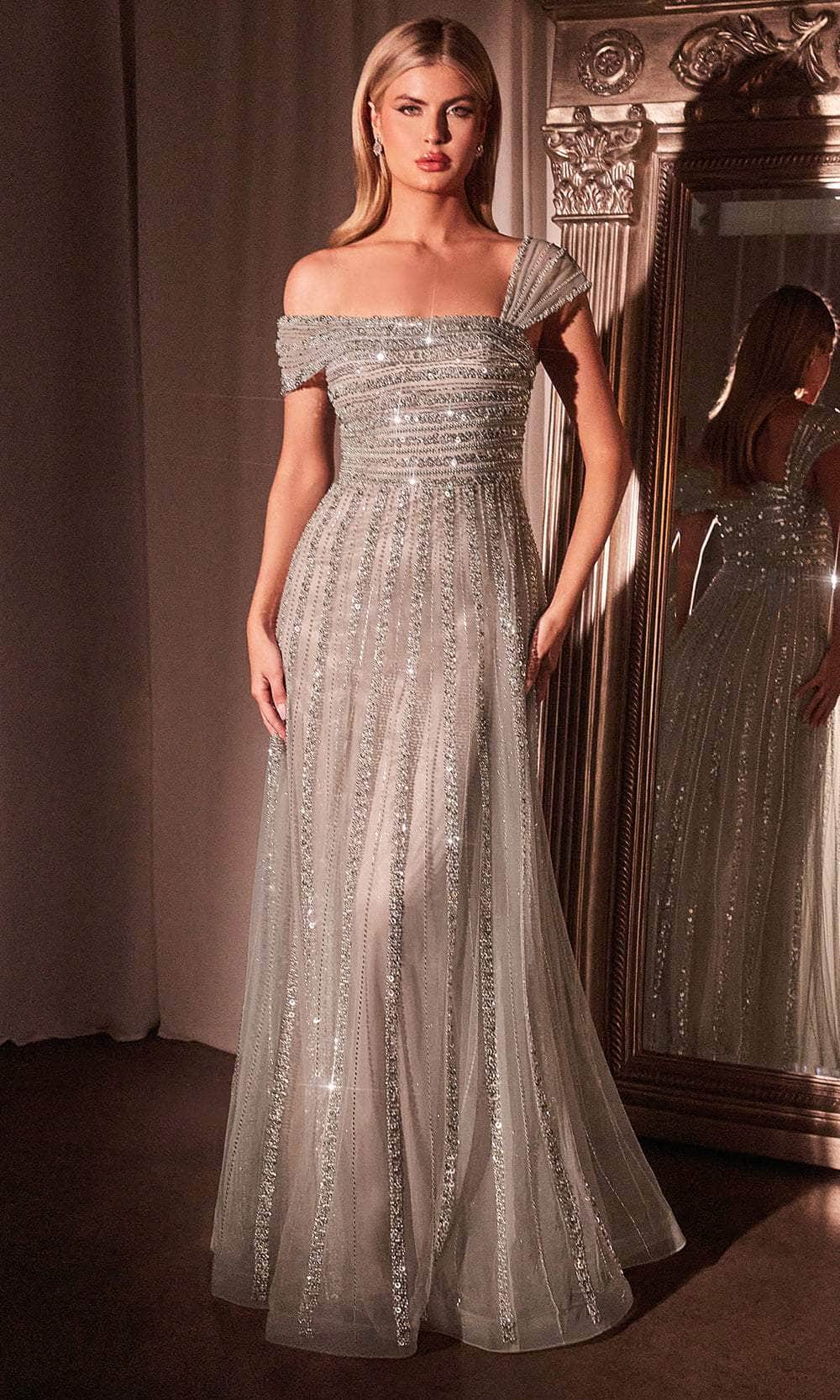 Unleash your inner DIVA in this fabulous creation from Ladivine CD0238. Beautifully embellished with beaded and sequin in a linear pattern, the dress creates a striking shine that will make you stand out. The off-shoulder asymmetric neckline and cap sleeves frame your shoulder captivatingly. The mid-open back cut offers a tasteful glimpse of your skin while being fastened by the center zipper closure. Designed to flatter every curve, the skirt flares an A-line silhouette that cascades to the floor-length hem and finishes with horsehair for extra charm. This Ladivine CD0238 dress ensures your special occasion is unforgettable. Models are wearing Black-Nude, Mocha Gold, and Silver-Nude colors.