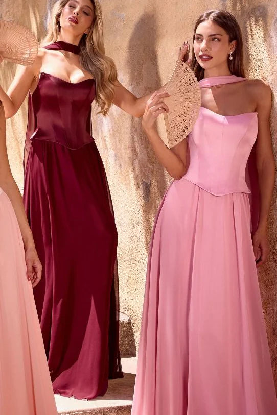 Make a graceful statement in Ladivine CD386. This A-line chiffon gown features a sculpted corset bodice with a curved neckline and elegant seamwork that enhances the figure. The flowing skirt adds soft movement, while the detachable sheer scarf lends a dreamy finish. With its flattering silhouette and supportive fit, this gown is ideal for bridesmaids, wedding guests, or any formal celebration. Ladivine CD386 blends sophistication with romantic charm. Models are wearing Black, Blush, Dark Burgundy, Dusty Rose, Lavender, Lt Blue, Lt Yellow, Navy, Sage, and Smoky Blue variants