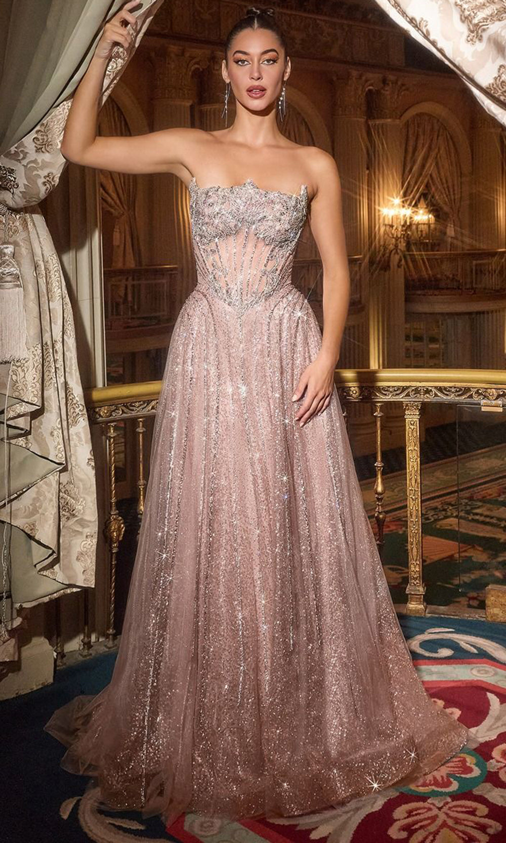 A sense of enchantment defines the Ladivine CD724, a strapless gown that promises sparkle and elegance for the most memorable nights. Its reverse sweetheart neckline crowns a sheer corset bodice enriched with crystal beaded appliques that provide luminous detail. The lace up back shapes the waist and ensures a secure, flattering fit. An A line skirt of tulle flows outward with volume, trailing into a graceful sweep train. The Ladivine CD724 embodies sophistication, creating a look that blends charm, radiance, and timeless design. Models are wearing Gold, and Mauve colors.