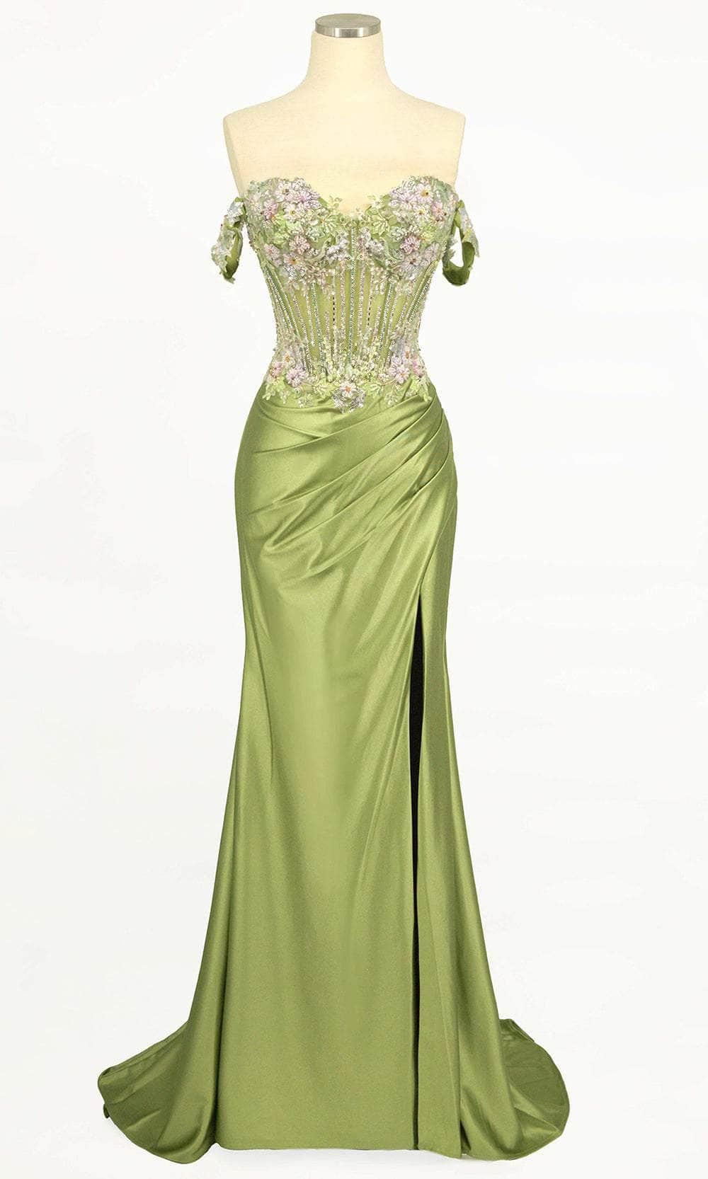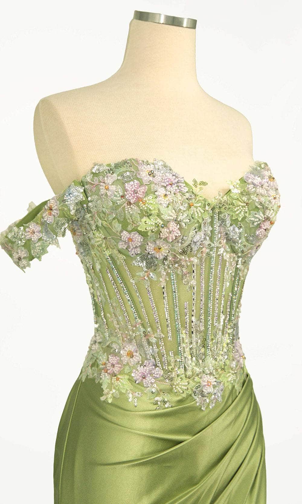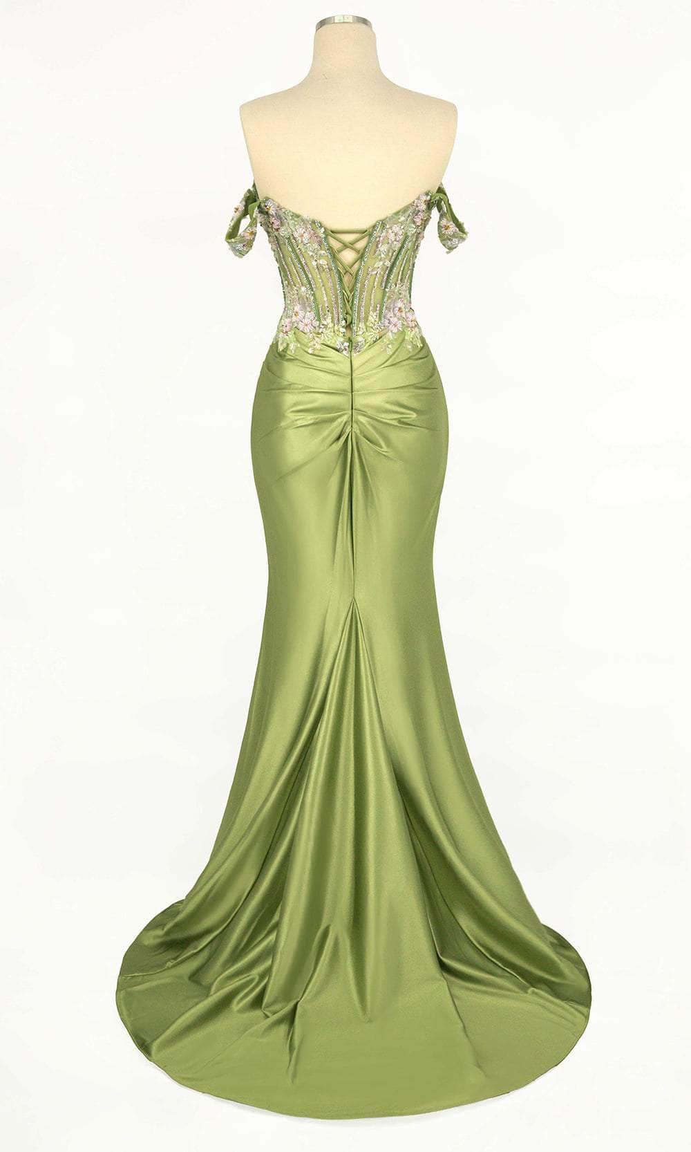 | Details: | Off-Shoulder, Corset Bodice, Beaded Floral Motif Top, Lace-Up Tie, Back Zipper Closure, Slit, Train |