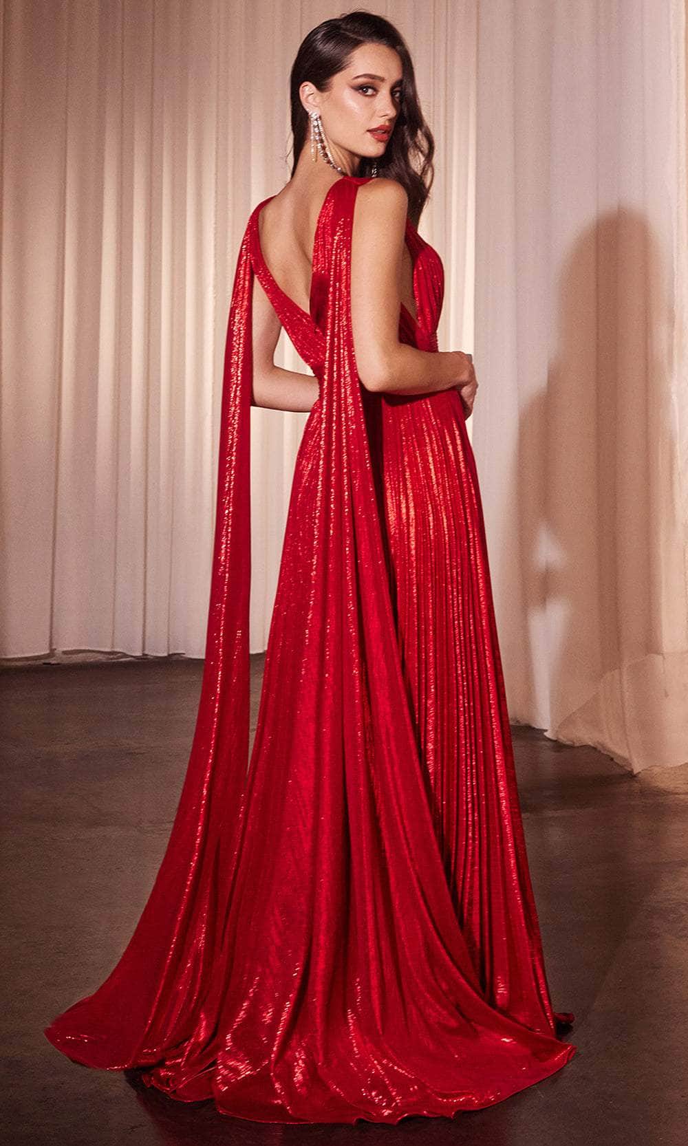 Make a fashion statement as you walk the red carpet in this Ladivine CD802 creation. Made with metallic fabric, this dress has a luxurious sheen making you the center of attention. The long cape-like sashes cascade beautifully from the wide shoulder strap, creating a dramatic effect with every movement. It displays a plunging v-neckline paired with a v-open back, and a sultry illusion side cutout. A ruched wide band that wraps around the waist accentuates your figure. Finished with a glamorous pleated bodice and an A-line skirt that slides stylishly to the sweeping train. Bring on that commanding beauty in this Ladivine CD802 dress. Models are wearing Red and Greenery colors.