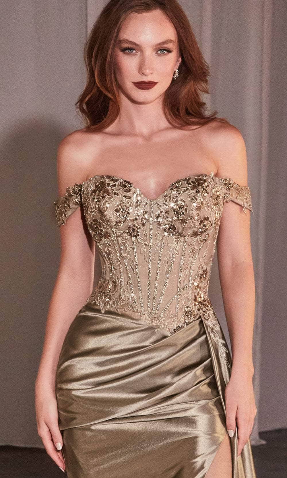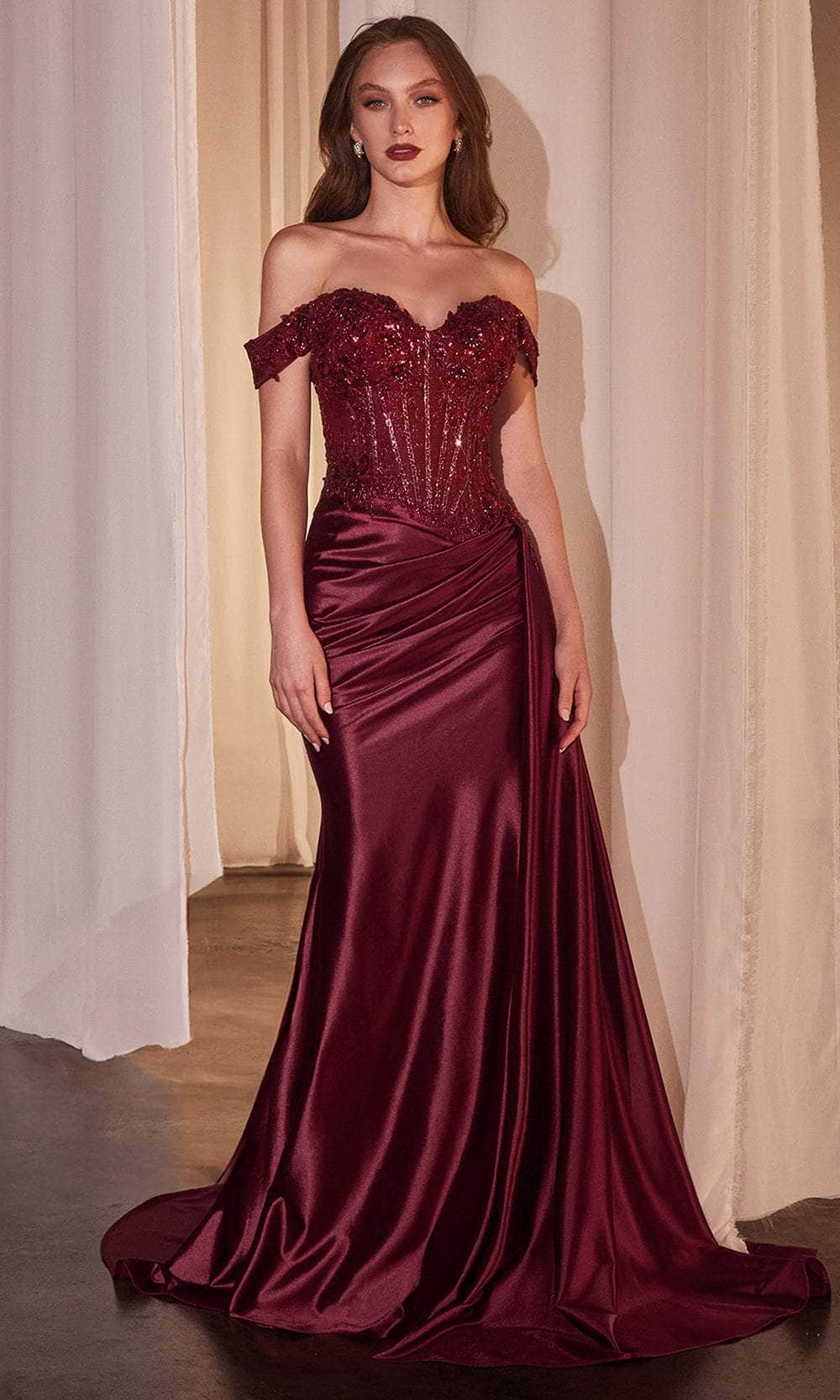 Let your inner diva shine through in this eye-catching creation from Ladivine CD803. This ensemble presents off-shoulder cap sleeves and a sweetheart neckline that lends a touch of elegance. The corset boning bodice offers the perfect amount of support, heightened by the lace applique and sequin decorations. The midrise V-shaped cut and zipper closure are features in the back. It also has a side sash and a ruched design around the hipline that make this dress truly unforgettable. The sheath skirt glides with poise to a full-length hem, culminating in an alluring high-leg slit. You will feel effortlessly beautiful and confident in this Ladivine CD803 dress. Models are wearing Black, Burgundy, Emerald, Mocha Gold, Navy, Silver, Dusty Blue, Eggplant, and French Gray colors.