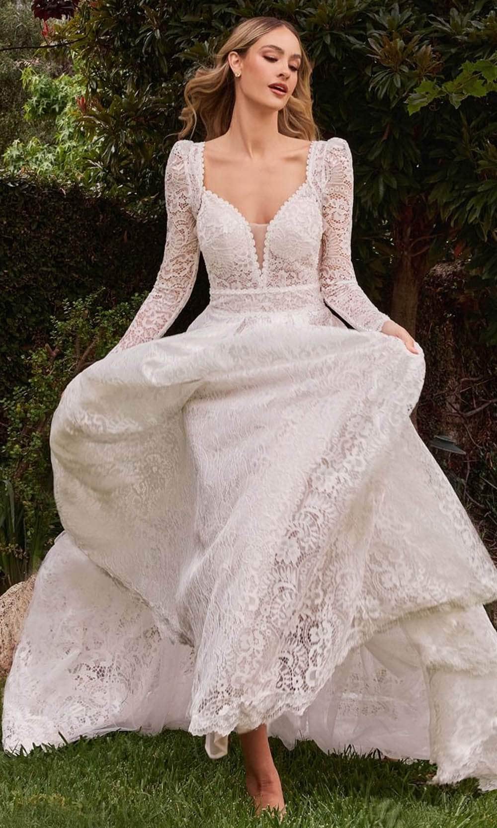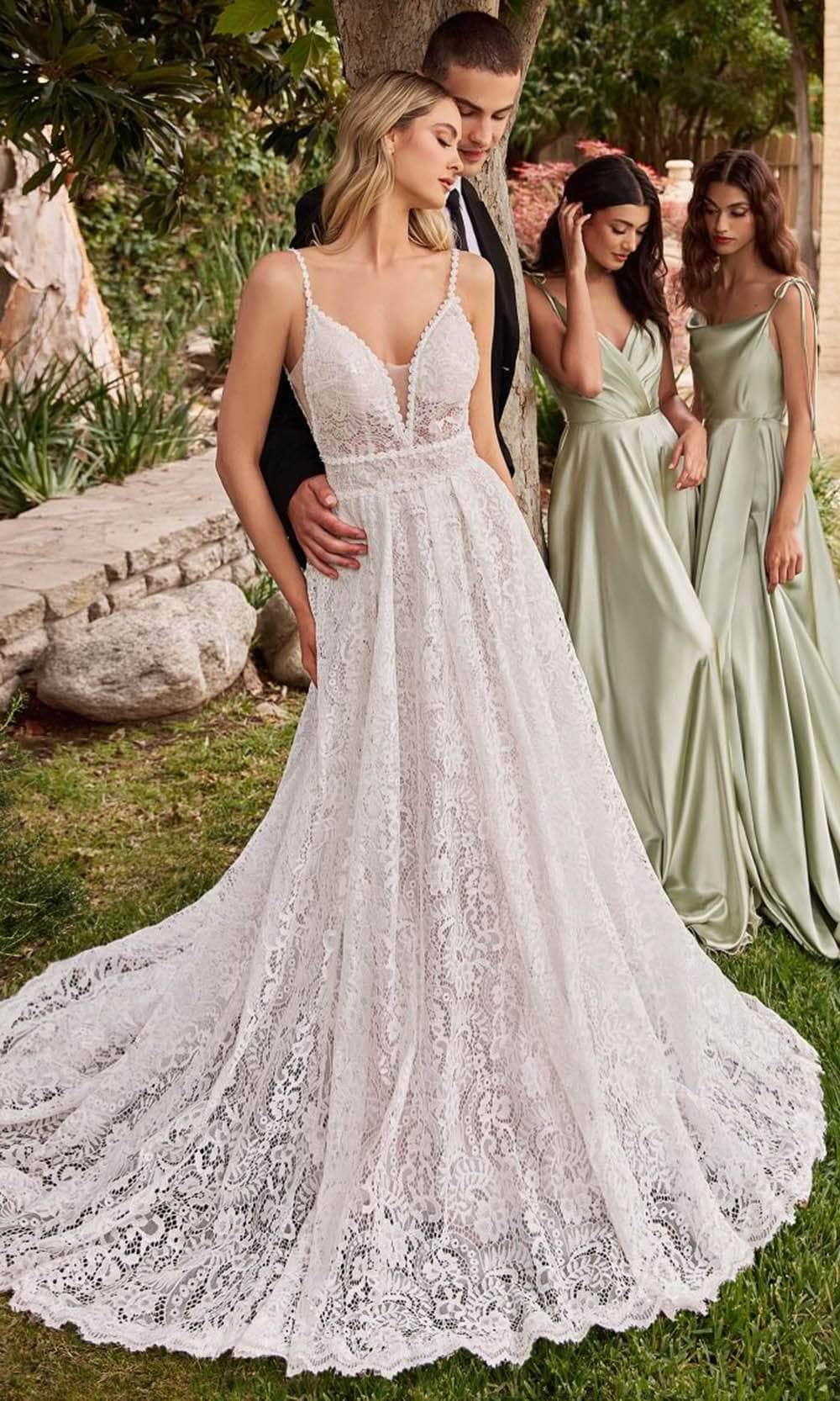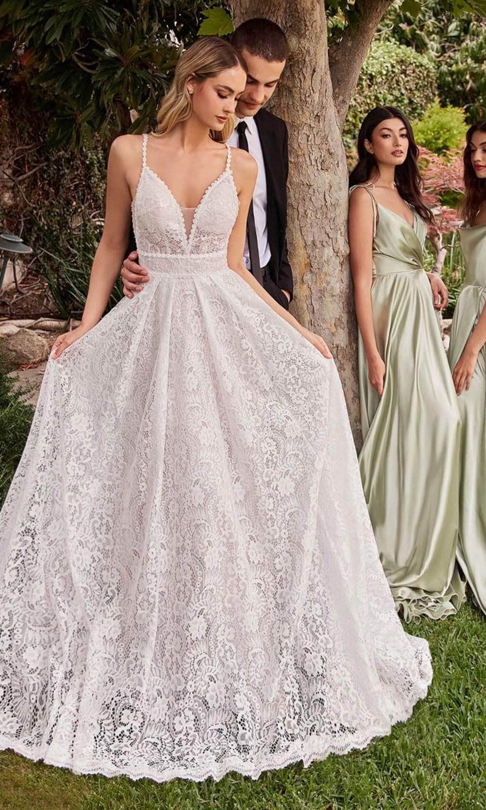 Embrace the essence of romance with Ladivine CD862W, a stunning A-line bridal gown. Crafted from luxurious guipure lace, you'll feel like royalty as you make your grand entrance on your special day. With removable sleeves and side cutouts, you have the flexibility to create the exact look you desire, while the deep v-neckline adds a touch of sensuality and grace. The scalloped lace hem provides an elegant finish, enhancing the dress's ethereal charm. And, as the final exquisite touch, the intricate open back completes the look, ensuring you radiate beauty and allure from every angle in this Ladivine CD862W masterpiece. Model is wearing Off White color.