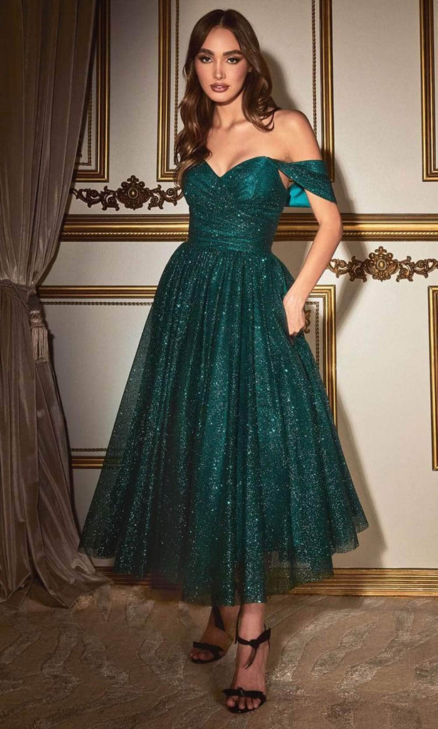 Dazzle and captivate in Ladivine CD870, an off-the-shoulder tea-length dress designed to steal the spotlight. This unique gown sparkles with glitter, ensuring all eyes are on you. The flattering A-line silhouette draws attention to your best features, while layered tulle adds volume to the skirt for a touch of drama. The dress is easy to wear with a convenient back zipper closure, making it the perfect choice for any special occasion where you want to shine. Ladivine CD870 sparkles and shines in every light. Models are wearing Emerald, Gold, Turquoise, and Red colors.