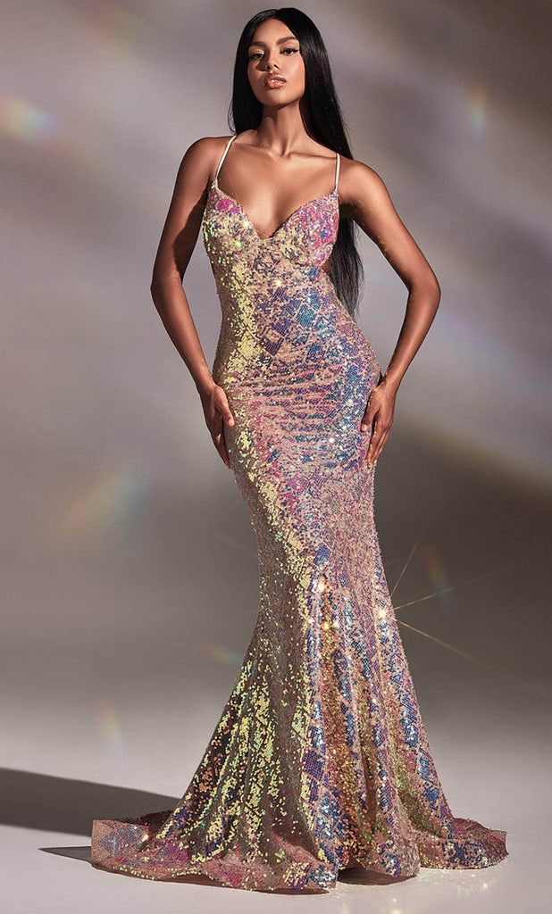 Be the delight of the crowd while glowing with flair in this impeccable Ladivine CD880 creation. Festooned with a crust of iridescent sequins flourishing a checkered styled motif, this gown features a deep v-neckline hanging from spaghetti straps. Designed with thin straps crisscrossing the open styled back, the mermaid skirt gleams with opulence as it flows fluidly into a sweeping denouement. Get love-struck in an amorous glow of this Ladivine masterpiece. Model is wearing the Opal Blush color.