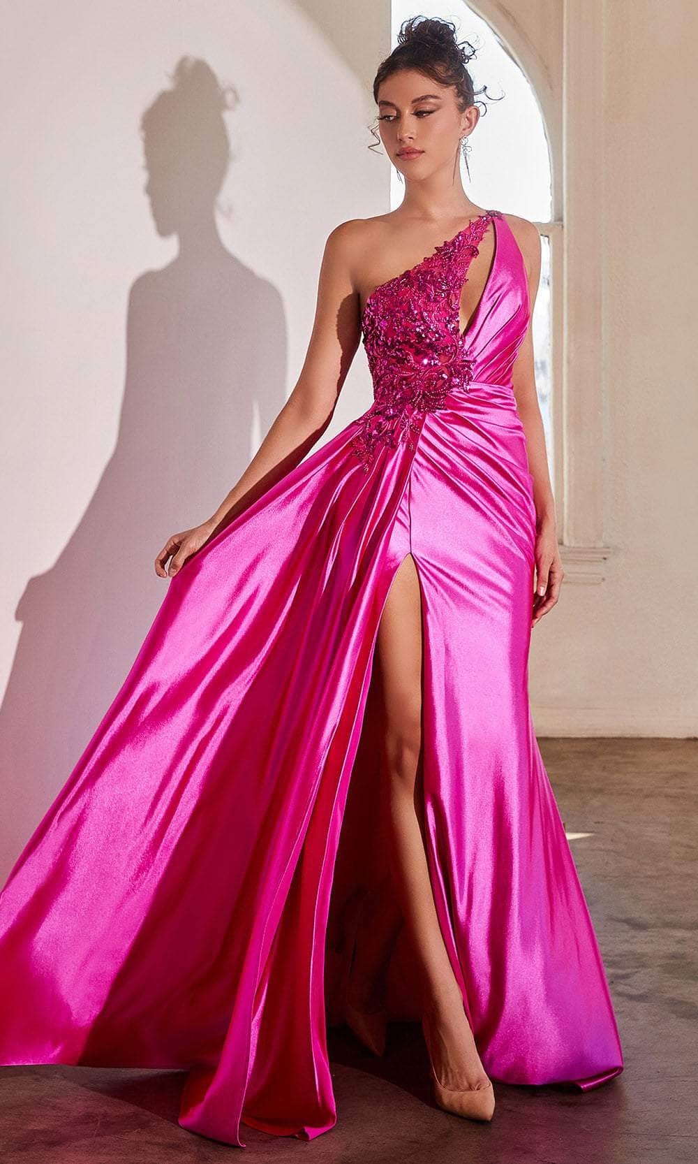 Make it your night worth reminiscing in this fabulous Ladivine CDS454 evening dress. A captivating asymmetrical neckline is displayed on the fitted bodice. A side of the top is designed with sequin embellishments, also featuring an alluring front keyhole. Additionally, the back is mid-open and is secured by a zipper for a refined finish. Aside from that, it has draping effects which makes the attire look even more appealing. A high slit is revealed on the sophisticated sheath skirt, also having a sweep train for added glamour. Strut your stuff in this fascinating Ladivine CDS454 masterpiece! Models are wearing Black, Champagne Gold, Fuchsia, and Robbin Blue colors.