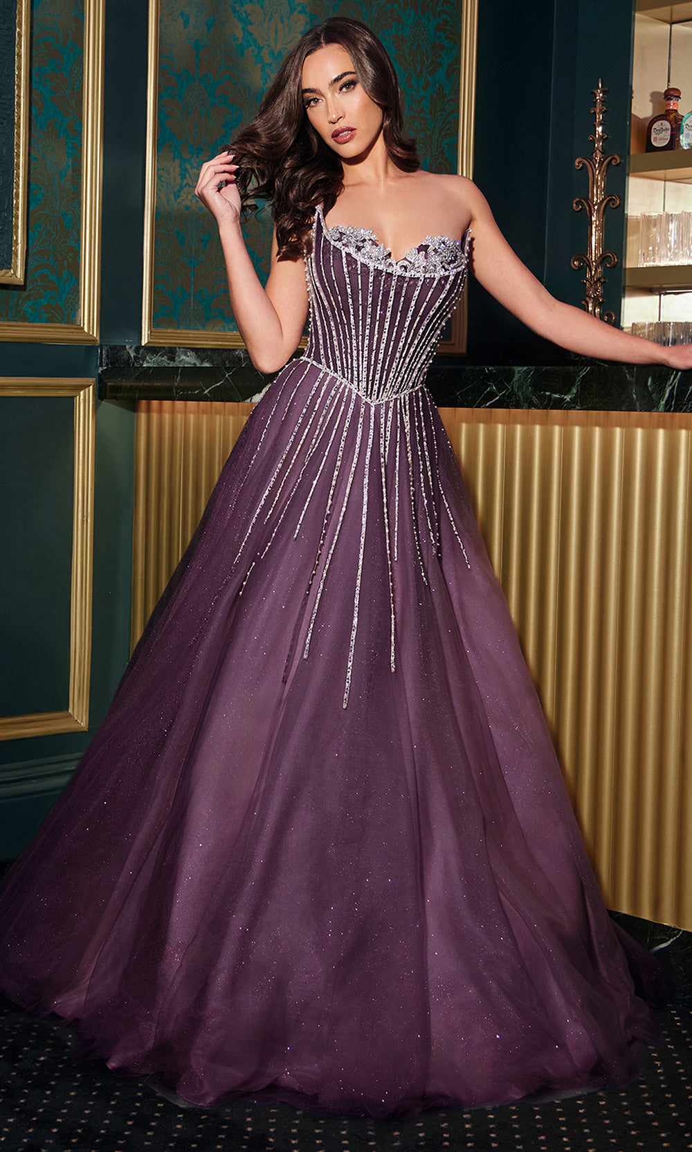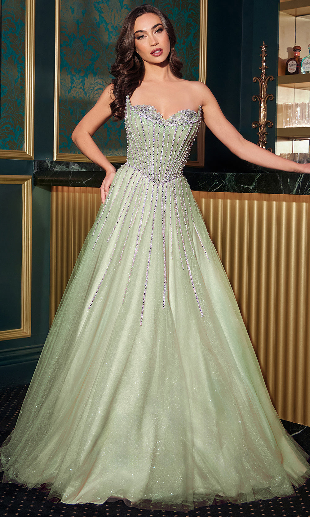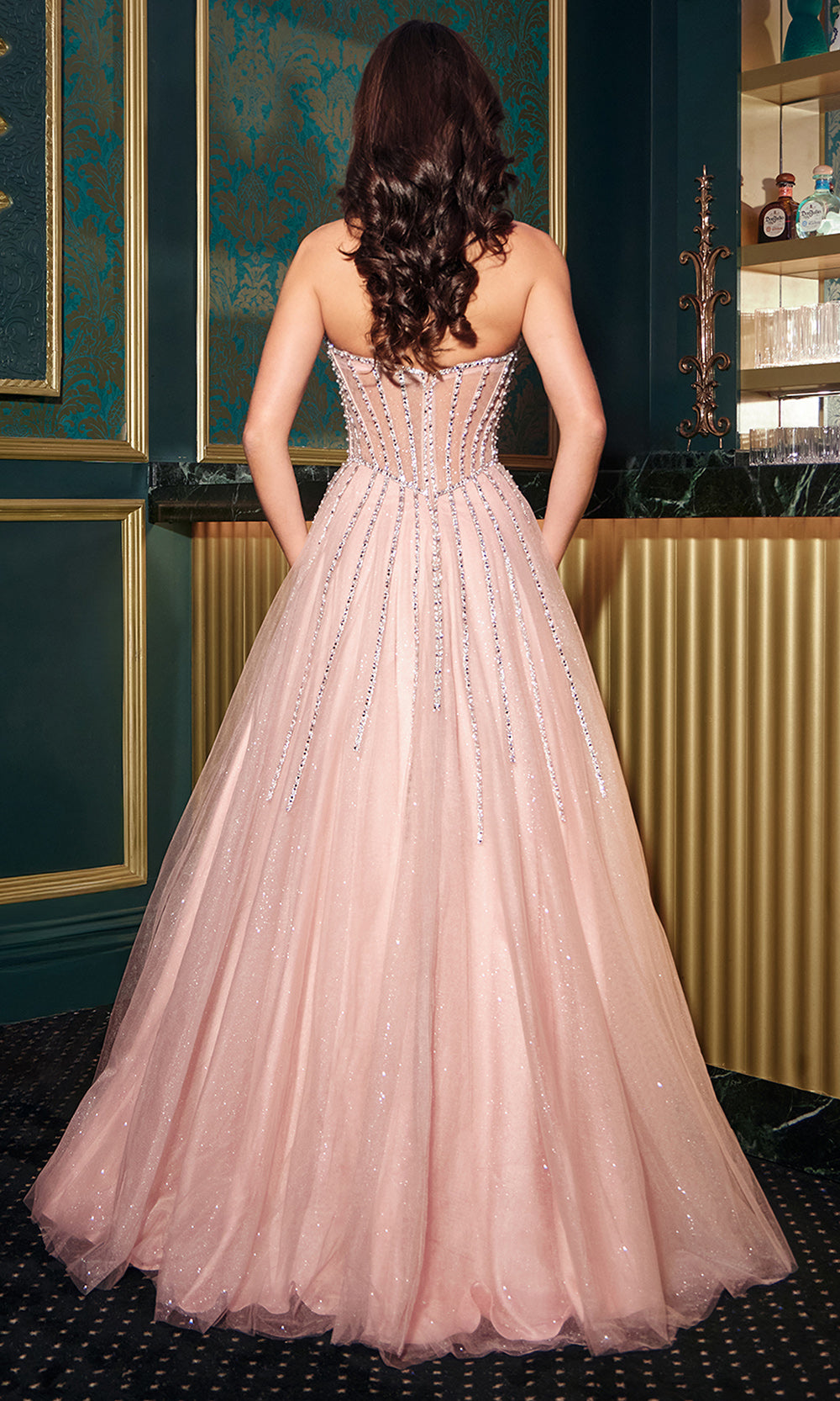| Details: | Linear Beading, Strapless, Sheer Corset Bodice, Mid-Open Back, Concealed Back Zipper, Floor Length |