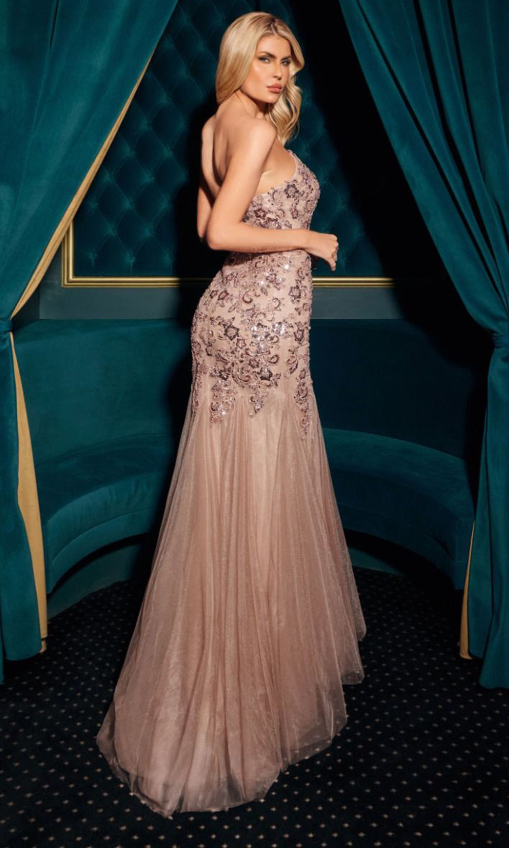 Glamour finds a new expression in the Ladivine CDS545, a strapless gown that celebrates timeless elegance with modern flair. The plunging sweetheart neckline is paired with a structured bodice richly adorned in floral sequins. A removable long sleeve jacket provides added versatility and coverage, complementing the intricate embellishments throughout. The mermaid silhouette embraces the figure before flaring into a floor-length hem that exudes dramatic presence. The Ladivine CDS545 is perfect for those seeking a statement piece that combines sophistication with striking detail. Models are wearing Black, and Mocha Gold colors.
