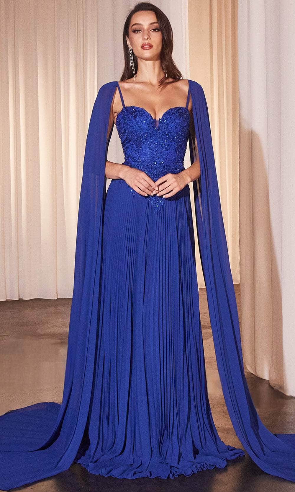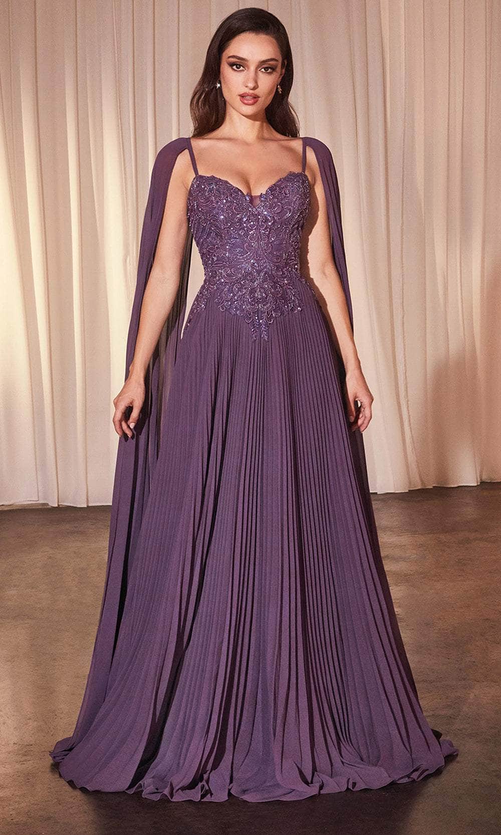 Claim the spotlight in this queenly creation from Ladivine CJ937. This ensemble displays spaghetti straps and long pleated cape sleeves that provide the option to style it on or off the shoulder. The intricate embroidery and sparkling beaded embellishment on the top bodice add a touch of opulence. It also features an alluring sweetheart neckline, a Basque waist, and a midrise back. The A-line skirt is designed in an accordion pleat for added volume and movement, completed in a full-length hemline. This Ladivine CJ937 style is a must-have wear for your special night. Models are wearing Dusty Lavender, Mocha, and Royal colors.