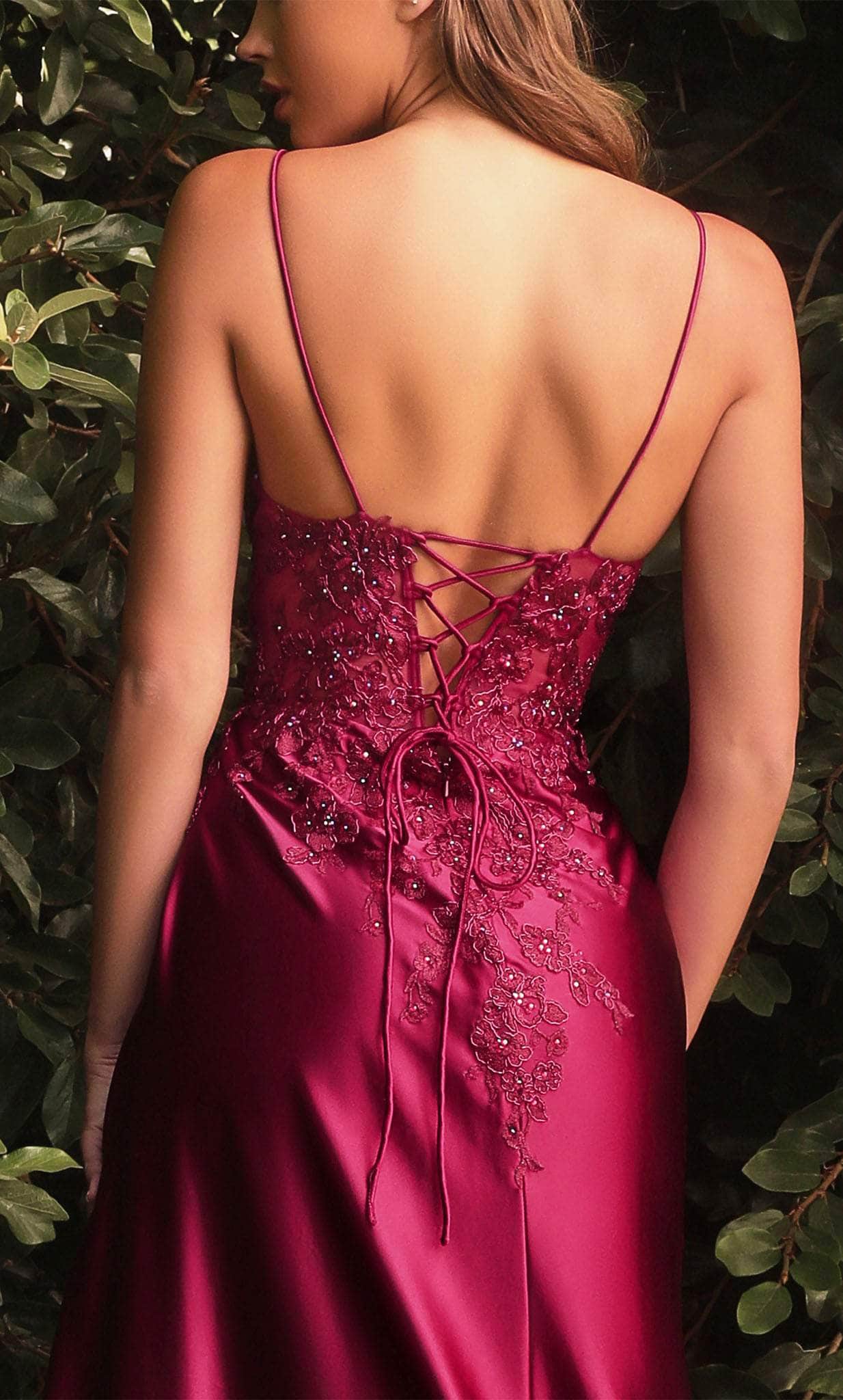Brave the evening with temptress beauty and grace wearing this Ladivine CM318 creation. Captivate in lace appliques and a beaded accent, this chic sleeveless gown has a sheer bodice with a deep v-neckline and spaghetti straps. The back is mid-open and is secured by a lace-up tie for a comfy fit. With ruching detail and a thigh-high leg slit, the satin skirt gently flows to the full length A-line silhouette and sweep train. You'll be envied in an unbeatable gown from Ladivine CM318. Models are wearing the Black, Burgundy, Emerald and Gold colors.