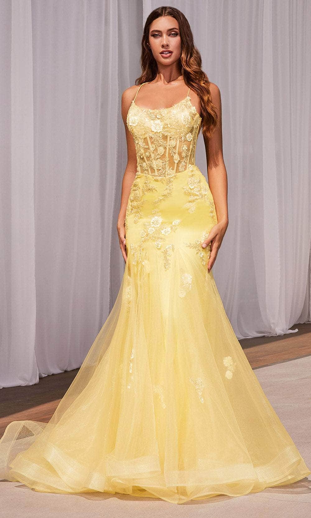 Celebrate that divine feminine loveliness in this creation from Ladivine D145. This sleeveless piece features an illusion corset bodice that wonderfully highlights your curves, and it is adorned with captivating 3D floral appliques and beadwork. It has spaghetti straps that elegantly outline your shoulders and offer support to the scoop neckline. A glimpse of skin is shown in the open back, which is fastened for a personalized fit by the strappy lace-up closure. The skirt creates a trumpet silhouette with tulle godets and a horsehair hem for volume, and a sweeping train finish. Turn heads instantly when you wear this Ladivine D145 masterpiece Models are wearing Lavender, Light Blue, Pink, Sage, and Yellow colors.