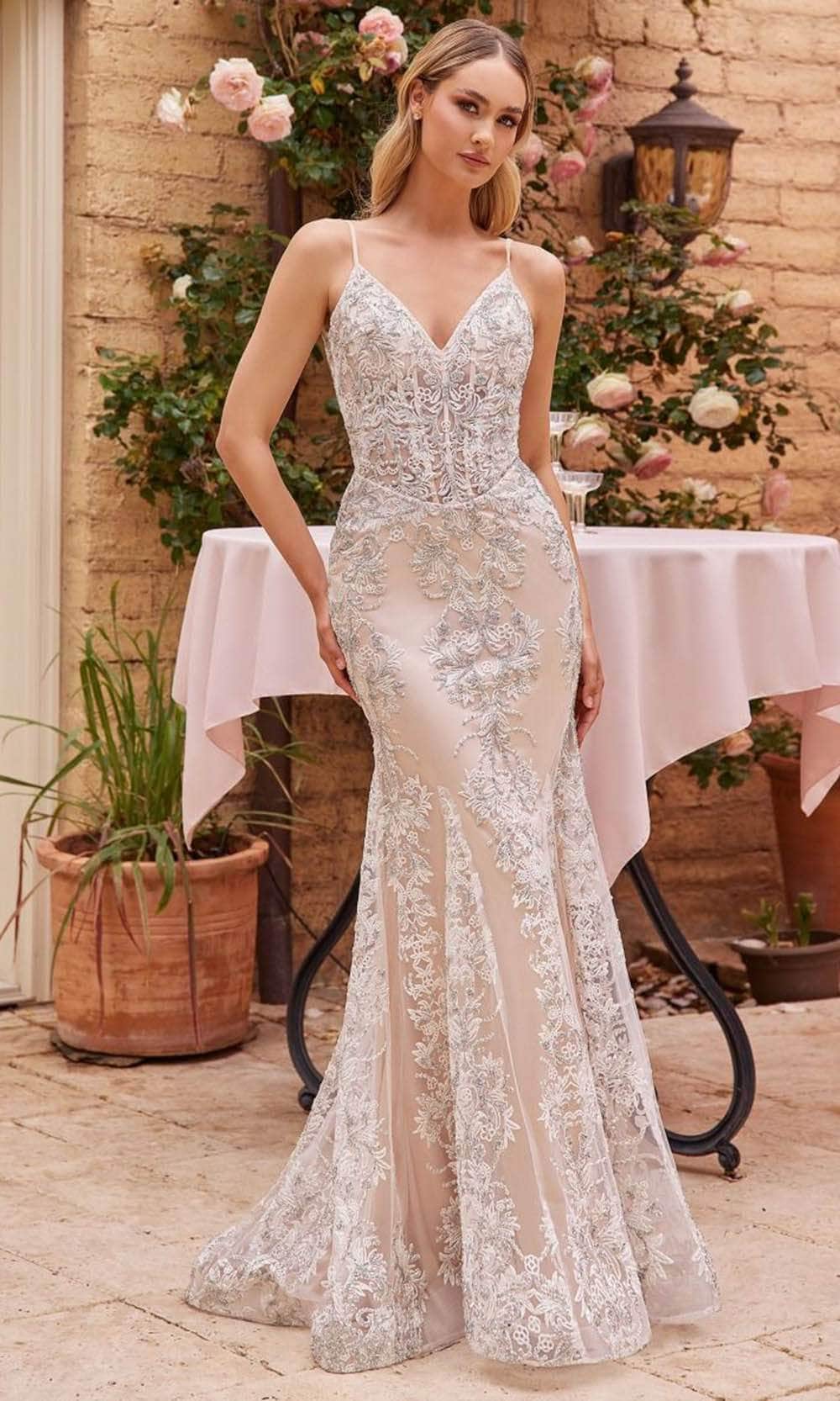 Achieve a regal presence on your special day with Ladivine J859W. This gown is lavishly embellished with sparkling embroideries that capture and reflect light, resulting in a captivating and radiant appearance. Delicate straps contribute an elegant touch to the sleeveless sheer boned bodice, while a V-shaped back introduces a note of sophistication. The gown is equipped with a convenient back zipper closure for effortless wear and concludes with a sweeping train, ensuring a grand entrance and leaving a lasting impression wherever you go. Ladivine J859W embodies the pinnacle of glamour and allure for any special occasion. Model is wearing Off White/Nude color.