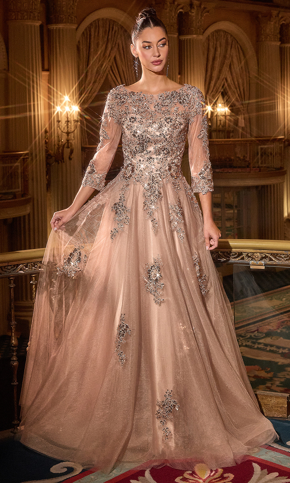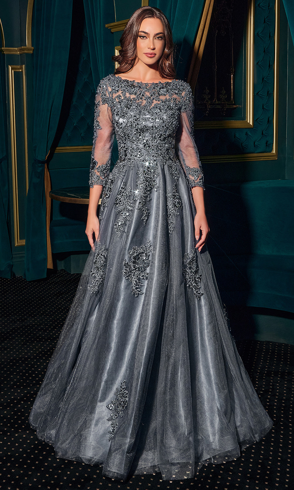 Regal sophistication defines the Ladivine J883, a gown created for the most graceful of occasions. The bateau neckline pairs beautifully with sheer three-quarter sleeves, offering modest coverage while exuding timeless charm. Intricate lace embroidery and sparkle accent enriches the bodice and continues through the voluminous ballgown skirt, layered with tulle for ethereal presence. A V-back detail adds allure to the classic silhouette, creating a refined yet memorable finish. With the Ladivine J883, every appearance becomes a statement of elegance and lasting beauty. Models are wearing Black, Emerald, Midnight Grey, and Mocha Gold colors.