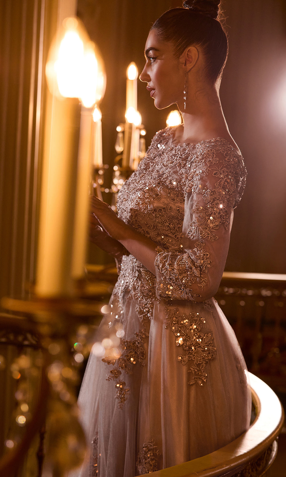 | Details: | Sheer Three-Quarter Sleeves, Embroidery, Sparkle Embellishments, V-Open Back, Concealed Back Zipper |