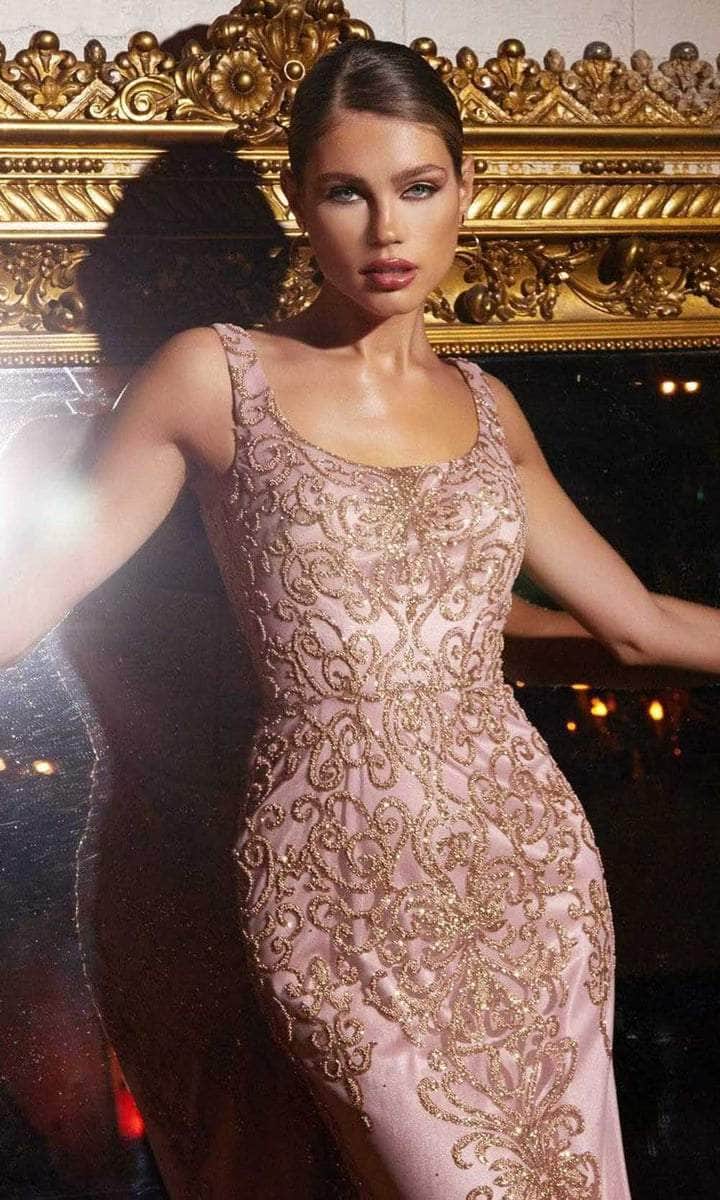 This gown has a scoop neckline with tank straps and is lavishly embellished with patterned beadwork. A scooped style back defines the mermaid skirt, which flares into a flutter detail that ripples into a pool of trains. Model is wearing the Rose Gold color.