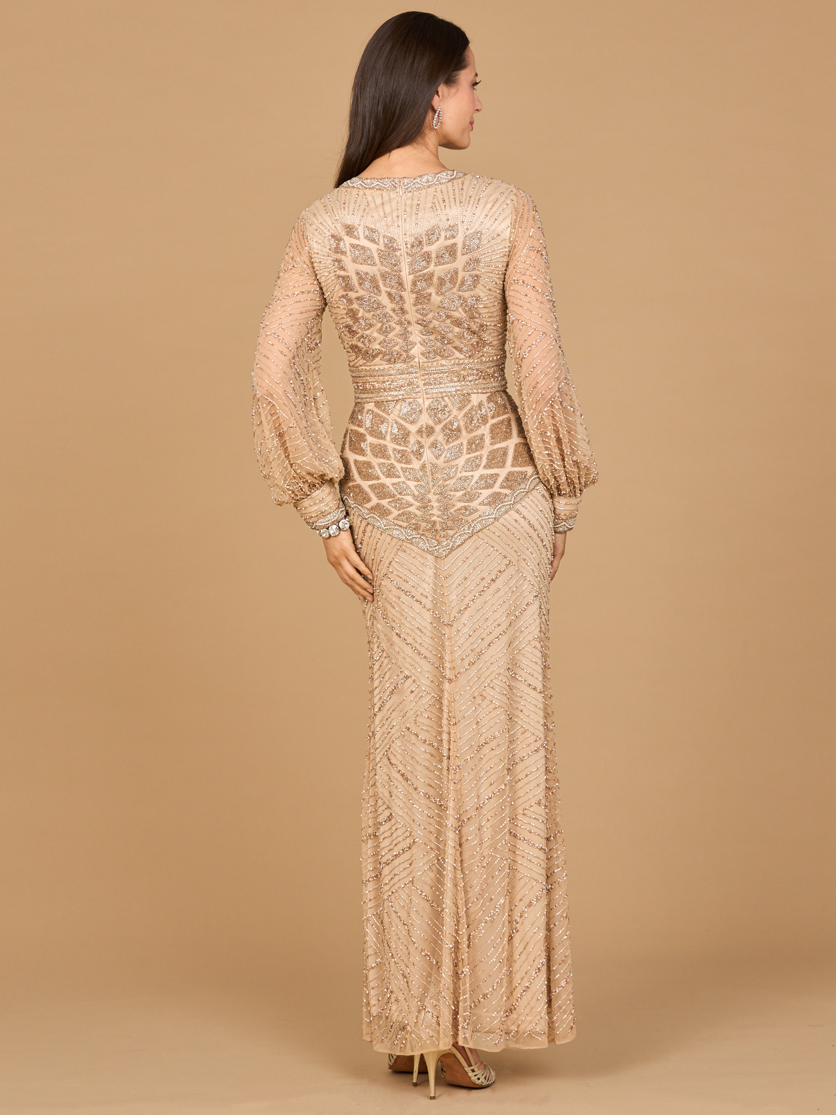 | Details: | Long Bishop Sleeves, Geometric Beadwork, Full Back, Back Zipper Closure, Fitted Shape |