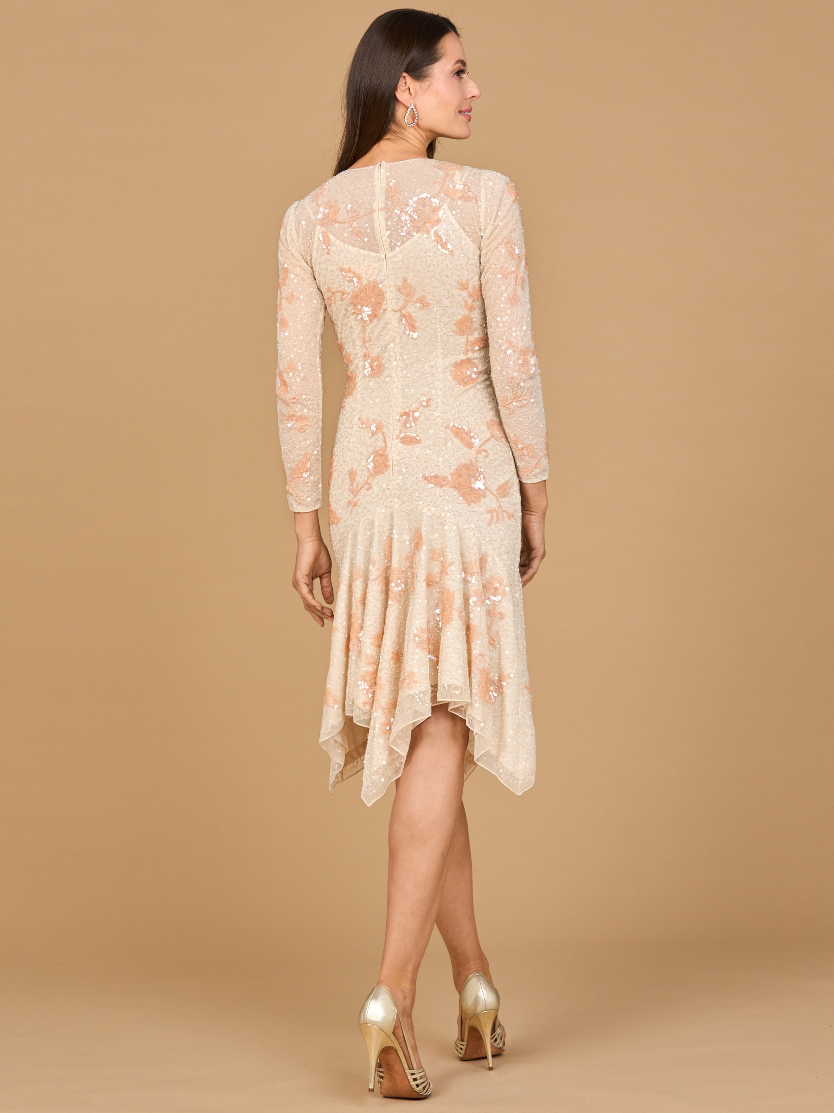 | Details: | Long Sleeves, Handkerchief Hem, Floral Beading, Illusion Detailing, Concealed Back Zipper |