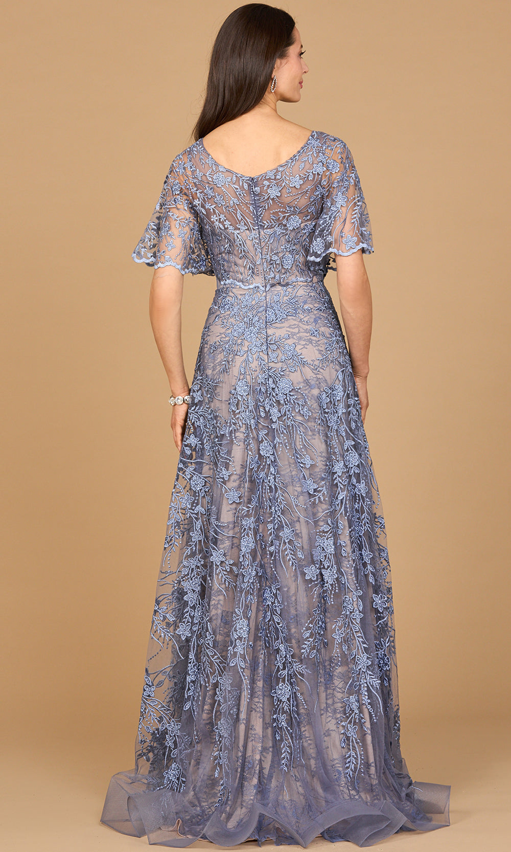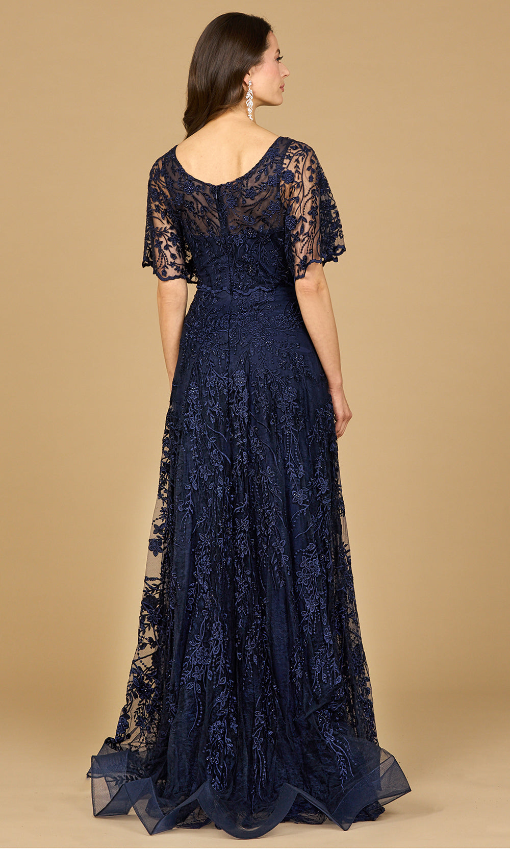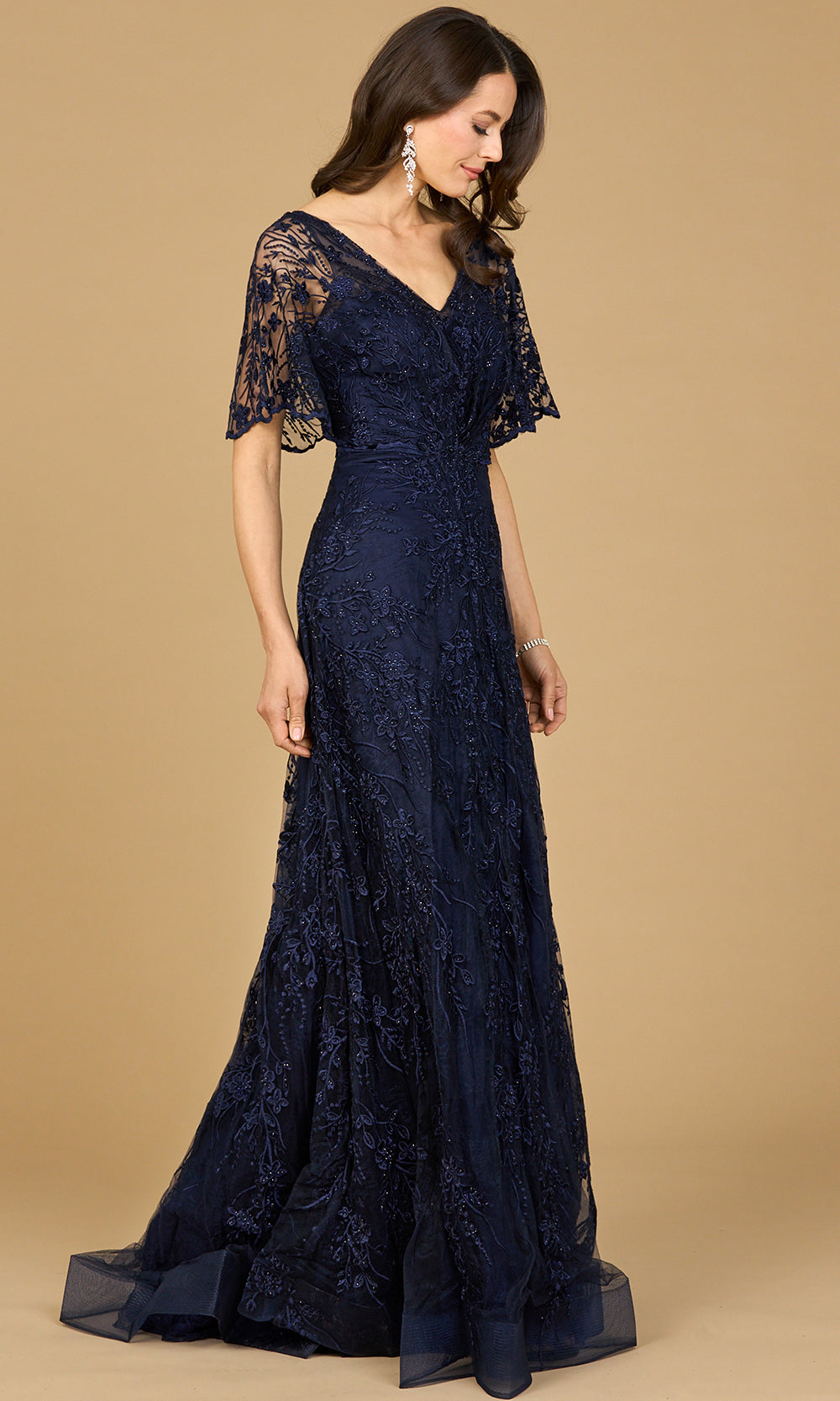 Lara Dresses 28923 expresses an air of delicate beauty through detailed embroidery that adds dimension and charm. The gown flows effortlessly from a softly draped bodice into a graceful A-line skirt, exuding timeless femininity. Flutter sleeves and v-neckline lend an ethereal touch, complementing the naturally defined waistline. Each bead accent reflects light subtly, creating a warm glow as you move. For elegant occasions that require sophistication with ease, Lara Dresses 28923 stands out as a picture of radiant refinement. Models are wearing Dark Periwinkle, and Navy colors.