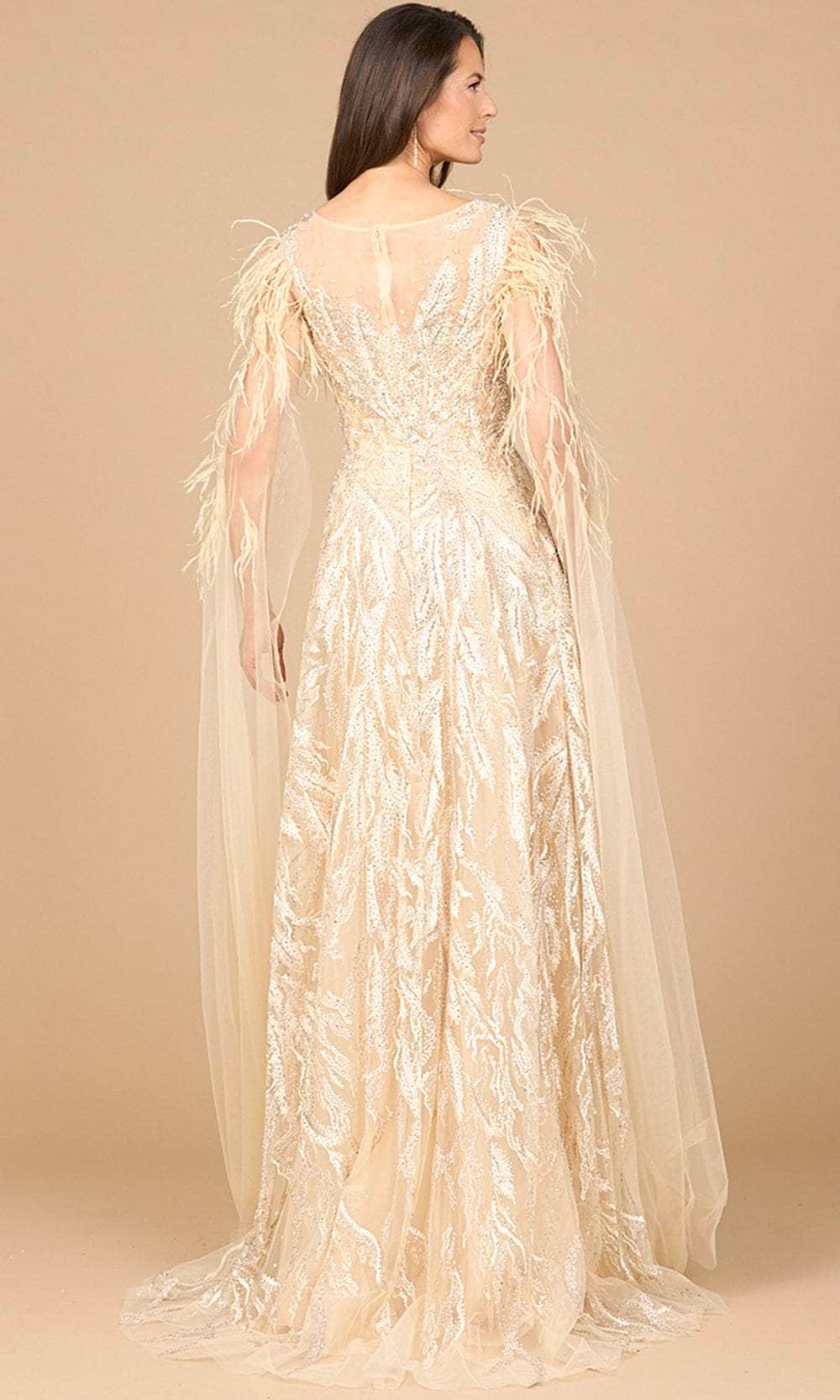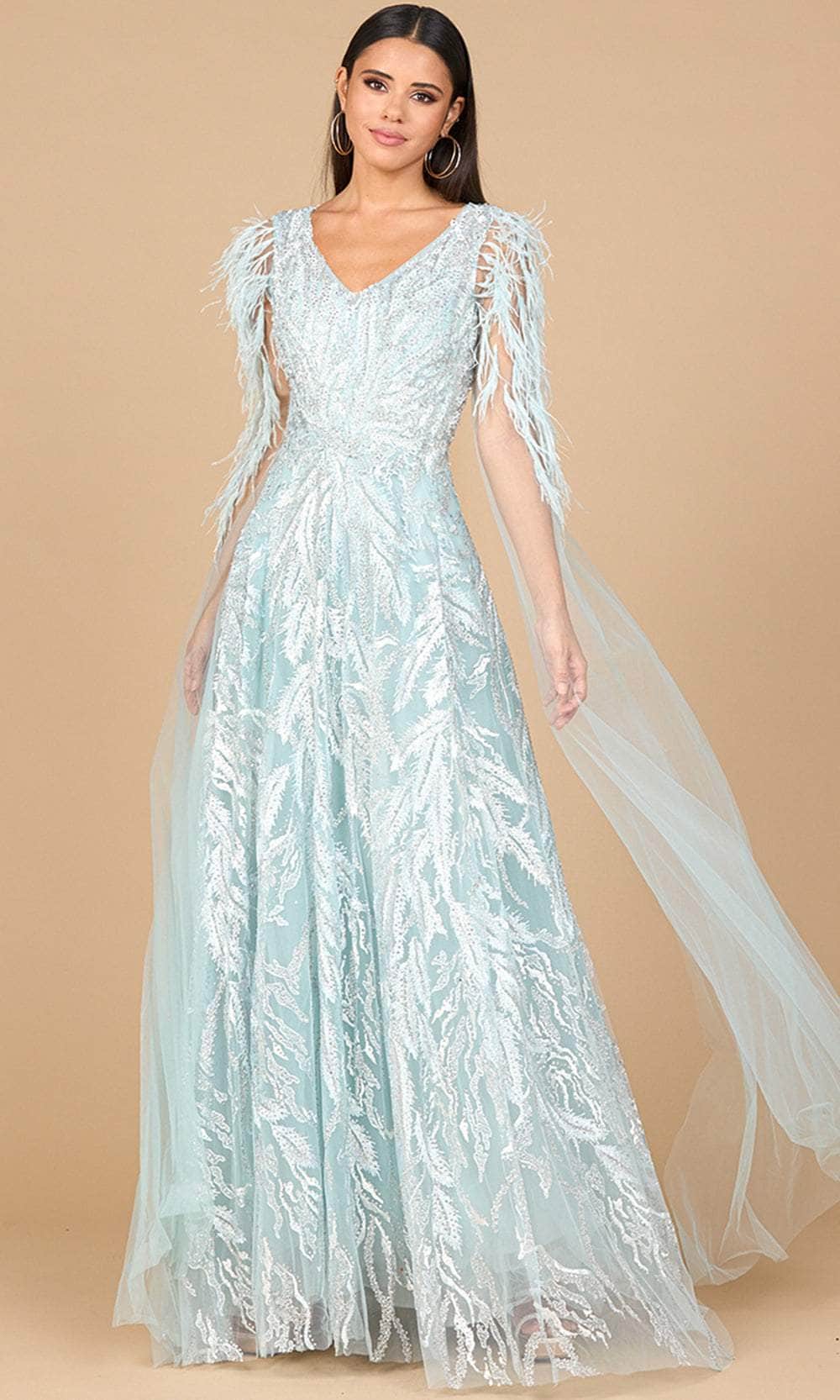 Turn heads in this Lara Dresses 28965 ethereal lace gown, embodying a vision of refined elegance. The deep V-neckline accentuates the decolletage, while sheer cape sleeves drape beautifully, offering a soft and flowing aesthetic. Feather accents add a luxurious touch, enhancing the floral lace embroidery on the fabric. With a graceful A-line silhouette, this gown moves effortlessly, making it a perfect choice for formal occasions and enchanting celebrations. Experience the outstanding effect in this Lara Dresses 28965. Models are wearing Champagne, and Dusty Blue colors.