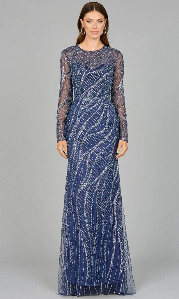 Fall in love with the iridescence of this creation by Lara Dresses 29039. Embellished with beadwork in a swirl pattern, the dress adds a touch of sparkle and luxury. It exhibits an alluring illusion jewel neckline with sweetheart lining and long sleeves. The partial illusion full back has a zipper closure at the center to ensure easy wearability. Elegantly enhancing your figure, the skirt creates a sheath silhouette that streams to the full length hemline. Orchestrate your moment to be prominent in this Lara Dresses 29039. Model is wearing Blue color.