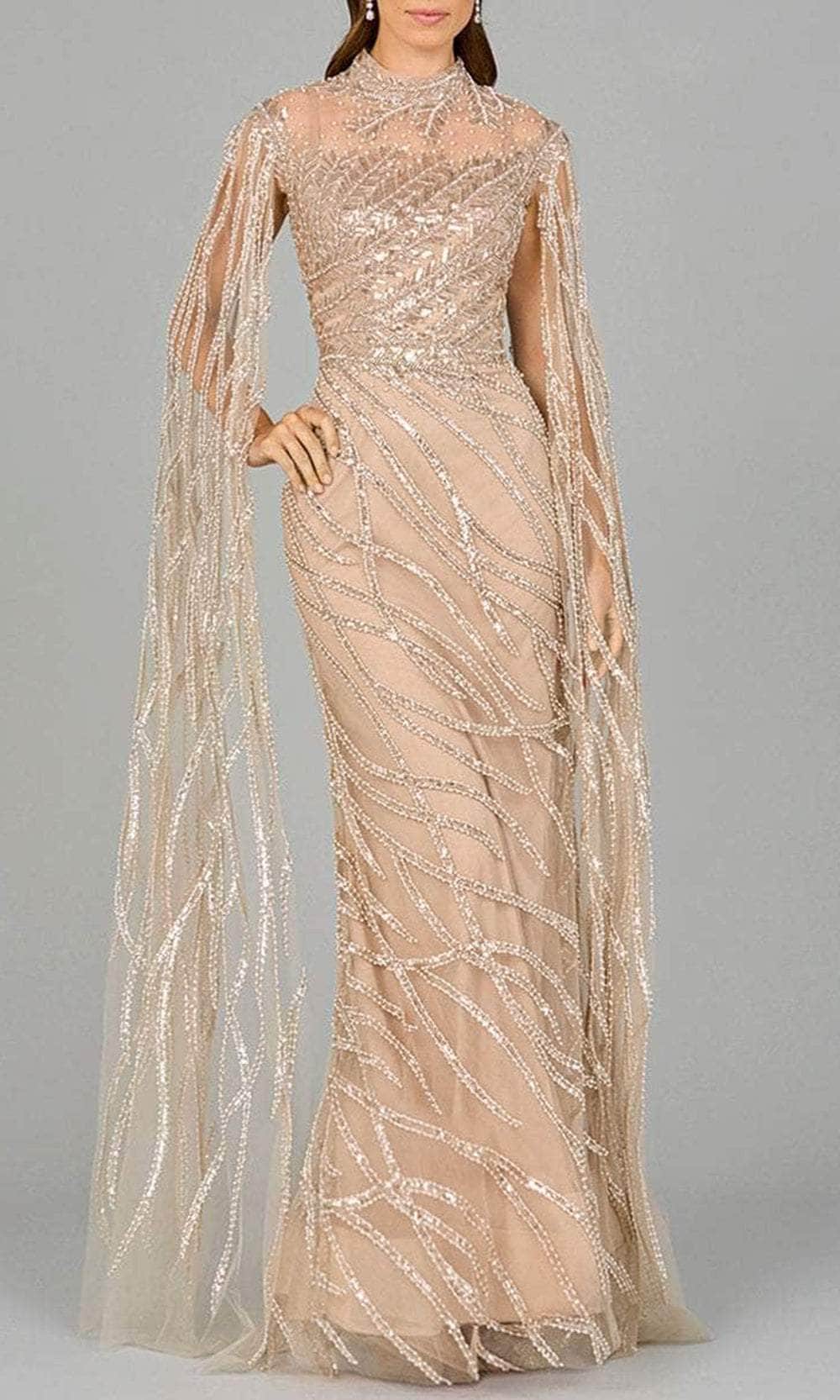 Exude chic elegance with Lara Dresses 29042 with its fitted design, high neck, and sweeping cape-style sleeves that gracefully touch the floor. The dress features a glimmering bodice and dreamy embroidery, offering both sophistication and coverage. Embark on a grand entrance as you step into this stunning ensemble, making a captivating statement at any event. Lara Dresses 29042 is the epitome of timeless glamour, ensuring you shine with every step and leave a lasting impression. Model is wearing Nude color.