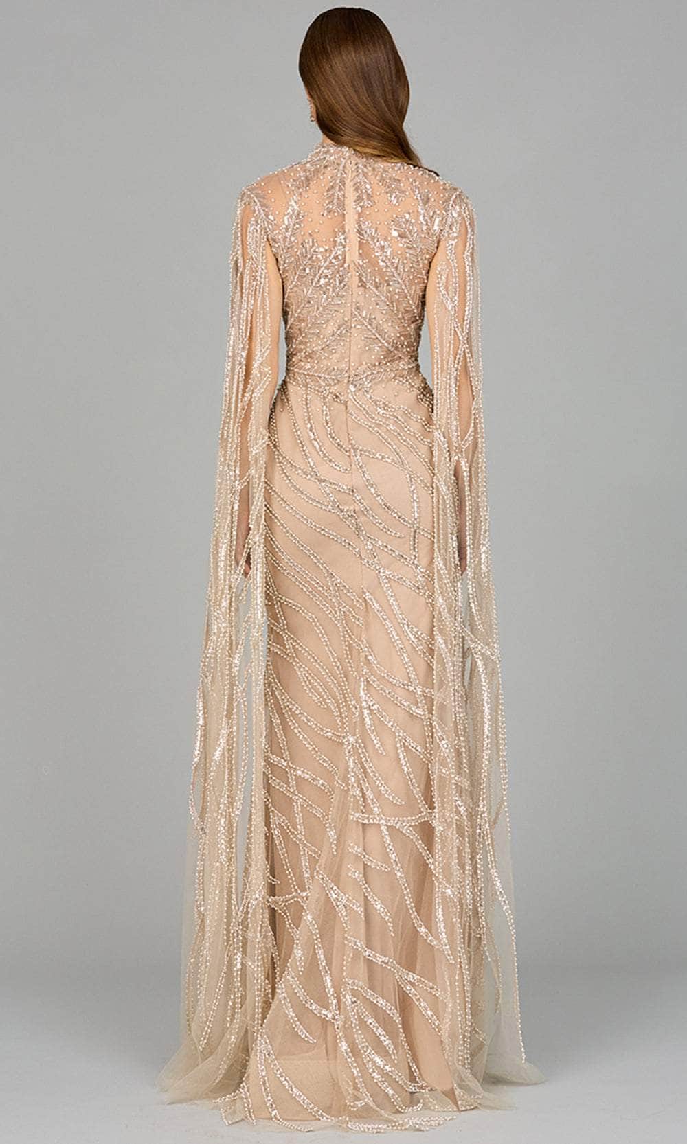 Details: Sequin Embellished, Embroideries, Long Cape Sleeves, Full Back, Back Zipper Closure