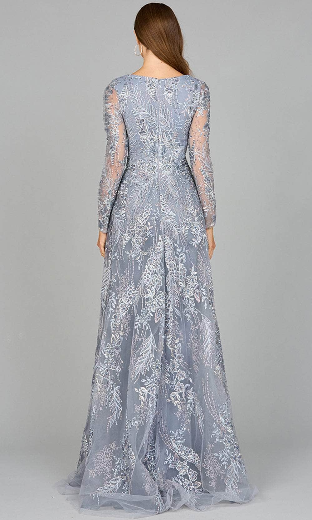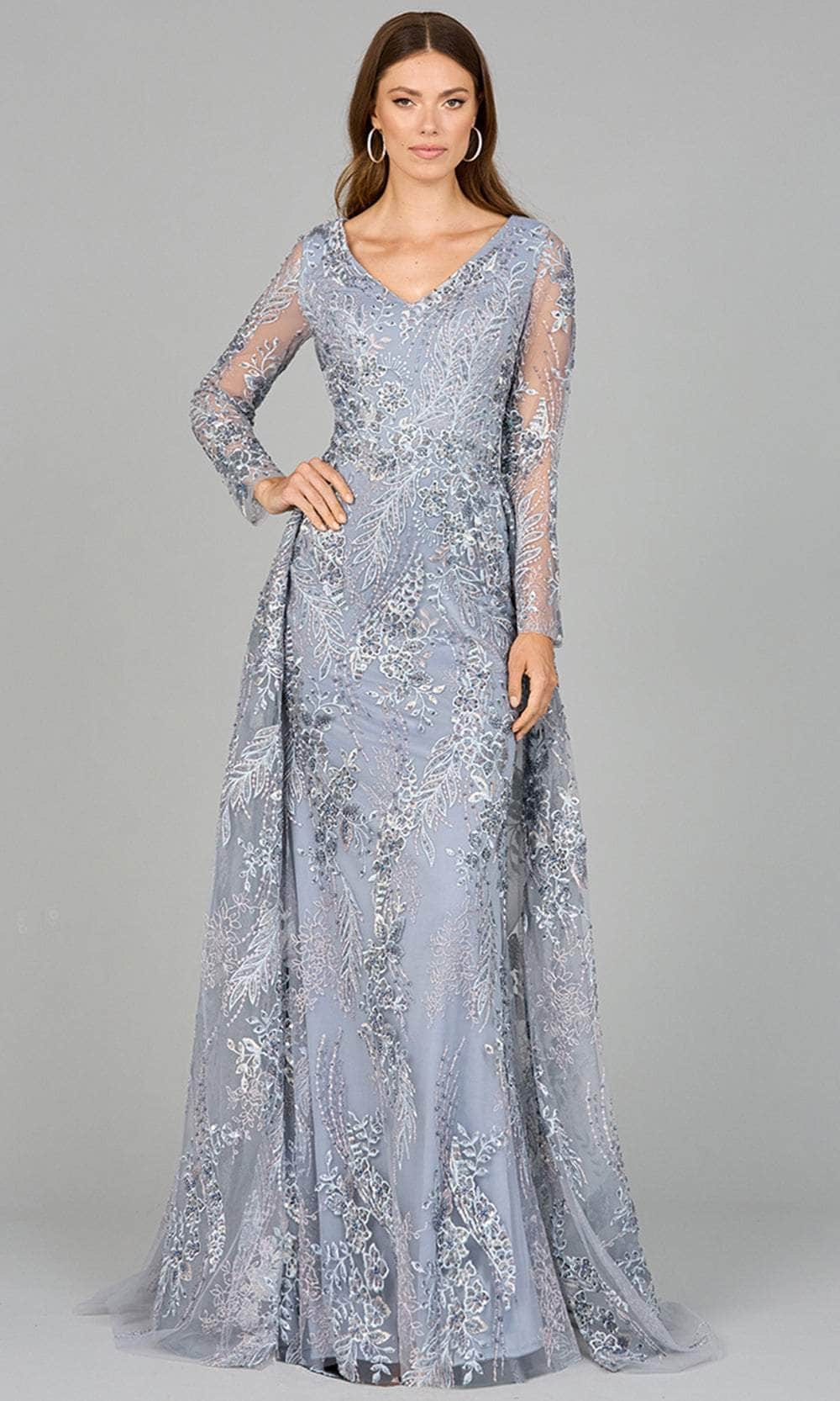 Captivate onlookers with the mesmerizing allure of Lara Dresses 29046. Adorned with intricate floral embroidery, this gown intricately enhances its tailored silhouette, boasting a v-neckline and sheer long sleeves that evoke sophistication. The meticulously crafted details continue with a concealed zipper closure gracing the full back. The sheath skirt, accompanied by an opulent overskirt and a graceful sweep train, epitomizes elegance. Indulge in the opulence and romantic essence emanating from every facet of this Lara Dresses 29046 masterpiece, a testament to its captivating beauty and refined craftsmanship. Model is wearing the Slate Multi color.